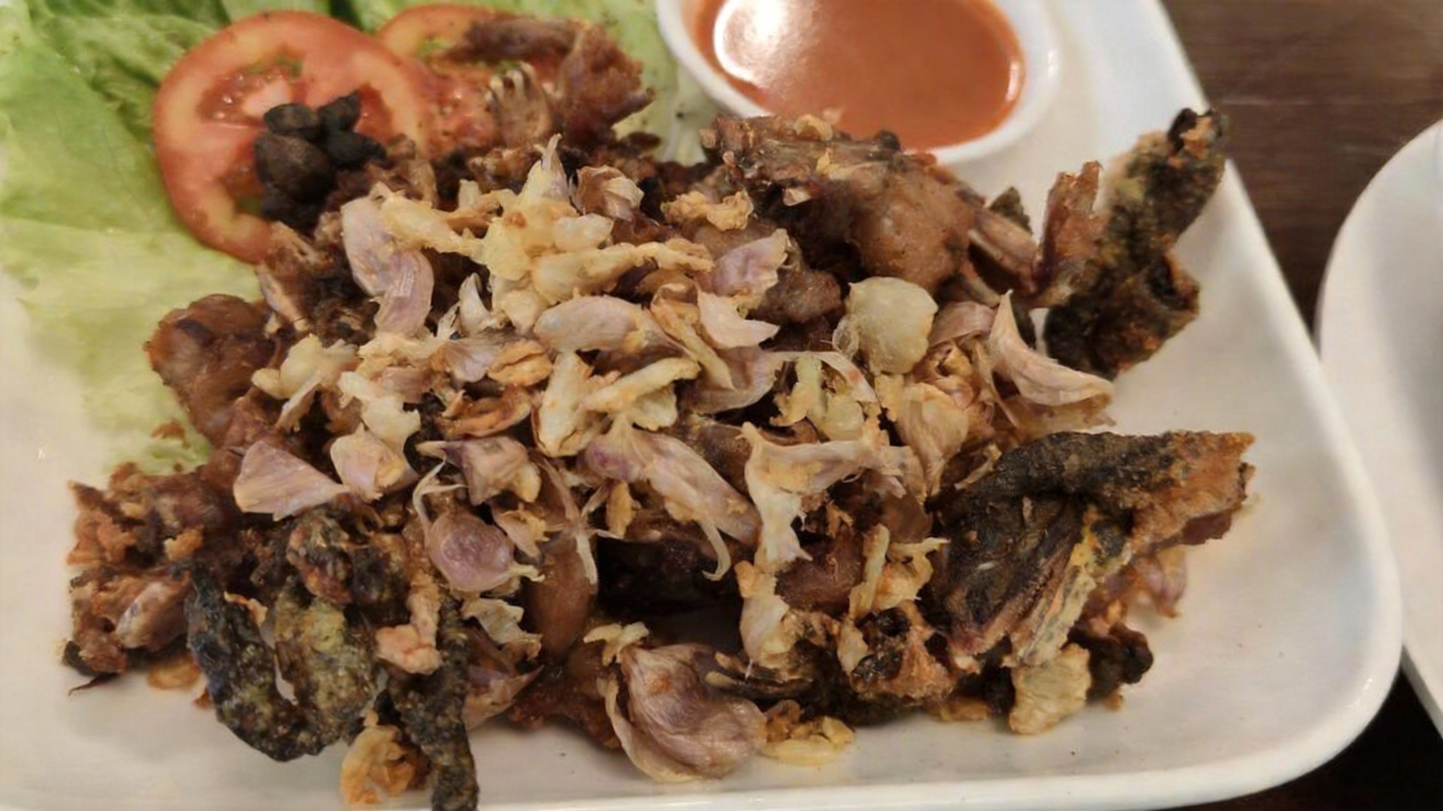 กบทอดกระเทียม – กบทอดกรอบนอกนุ่มใน ราดกระเทียมเจียวหอม ๆ กินเล่นก็ได้ กินกับข้าวก็ยิ่งดี