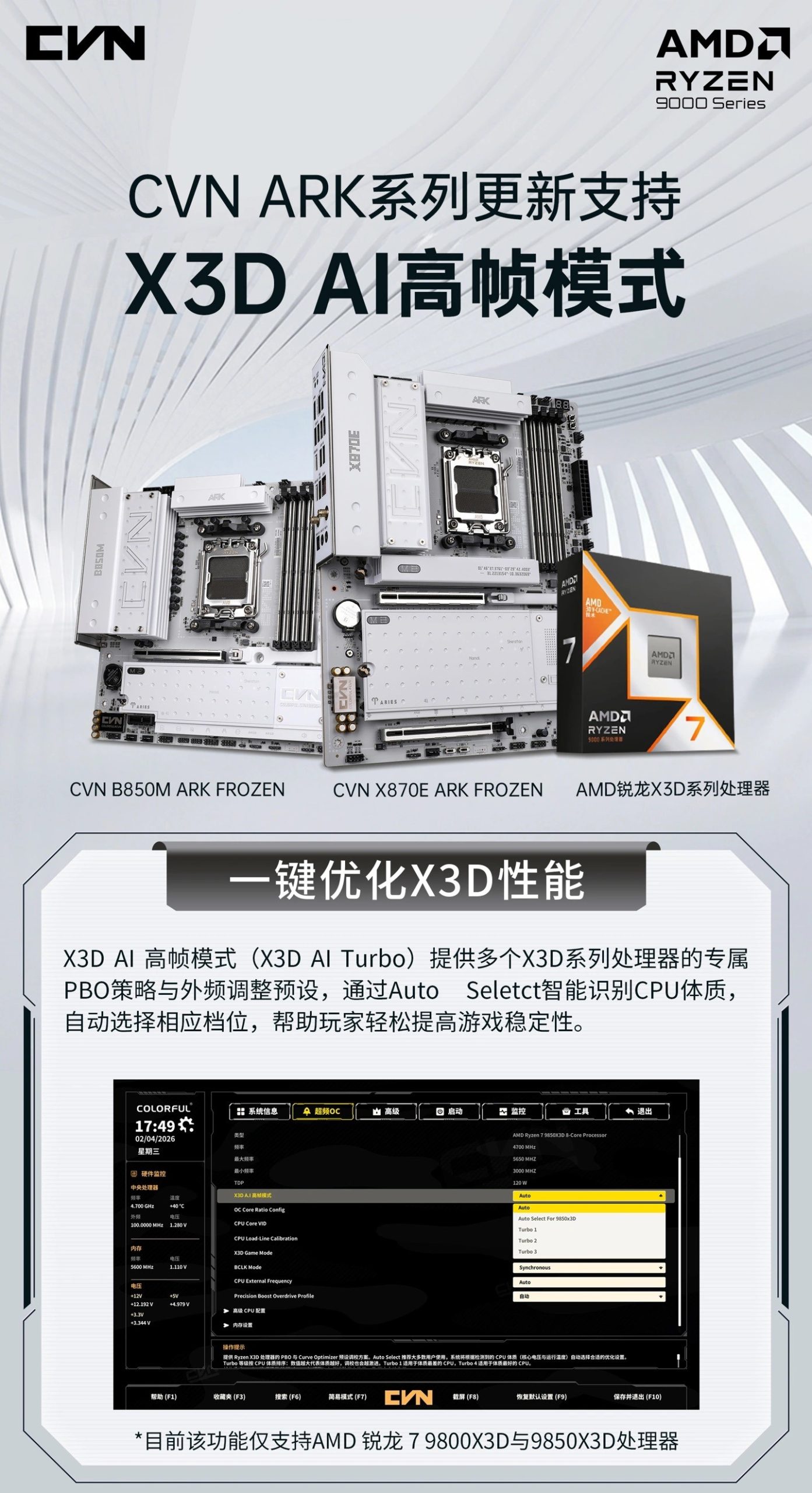 X3D AI Turbo คือระบบปรับแต่งประสิทธิภาพซีพียูแบบอัตโนมัติ ที่ฝังมาใน BIOS ของเมนบอร์ด Colorful รุ่นที่รองรับ โดยใช้แนวคิดเดียวกับฟีเจอร์ที่หลายคนคุ้นเคยอย่าง PBO (Precision Boost Overdrive) แต่ถูกปรับแต่งมาโดยเฉพาะสำหรับซีพียูตระกูล X3D