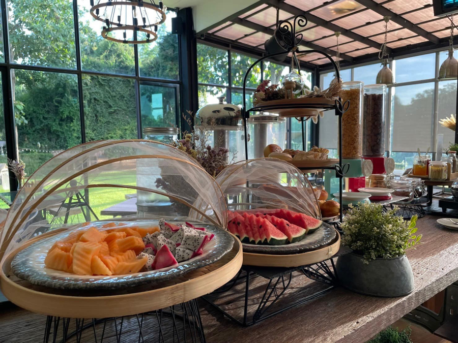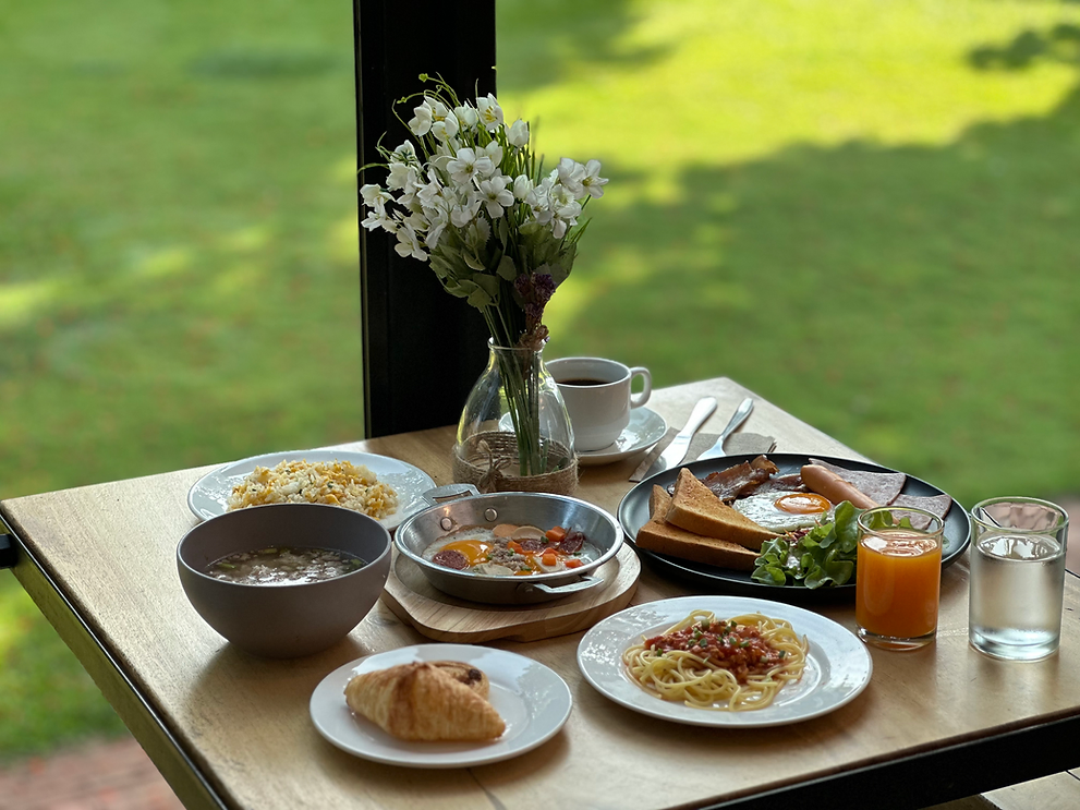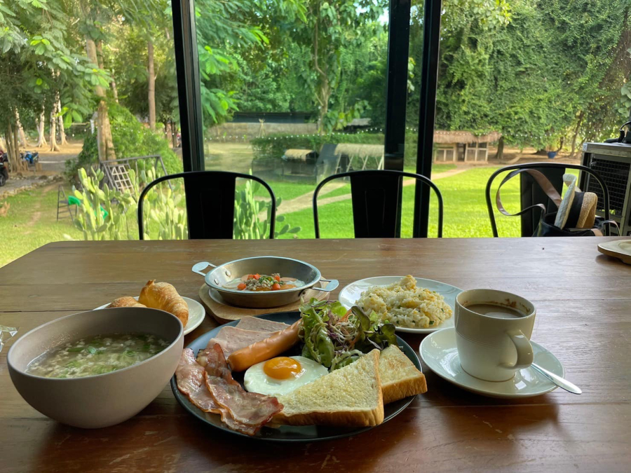 อาหารเช้าที่นี่มีบริการ เสิร์ฟถึงห้องพัก เลือกได้ทั้งเซตแบบไทยและแบบอเมริกัน ตื่นมาไม่ต้องรีบแต่งตัว แค่นั่งมองวิวจากห้องแล้วค่อย ๆ จิบกาแฟไปคือที่สุดของการพักผ่อน