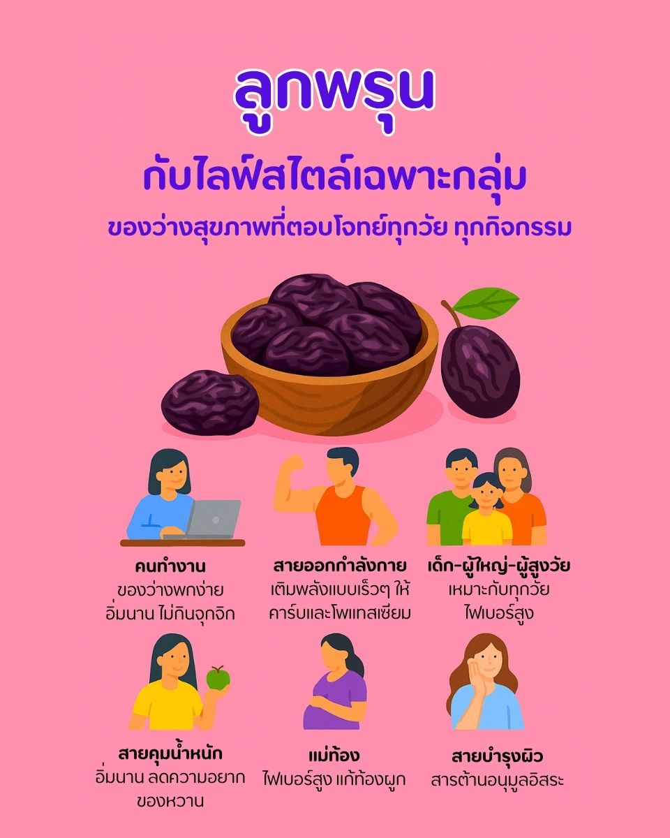 ที่น่าสนใจกว่านั้นคือ ลูกพรุนยังเป็นผลไม้ที่ ปรับให้เข้ากับไลฟ์สไตล์ได้หลายแบบ ไม่ว่าจะเป็นมนุษย์ออฟฟิศ สายออกกำลังกาย เด็ก ผู้ใหญ่ ผู้สูงอายุ หรือแม่ท้อง ก็สามารถเสริมลูกพรุนเข้าไปในชีวิตประจำวันได้อย่างลงตัว