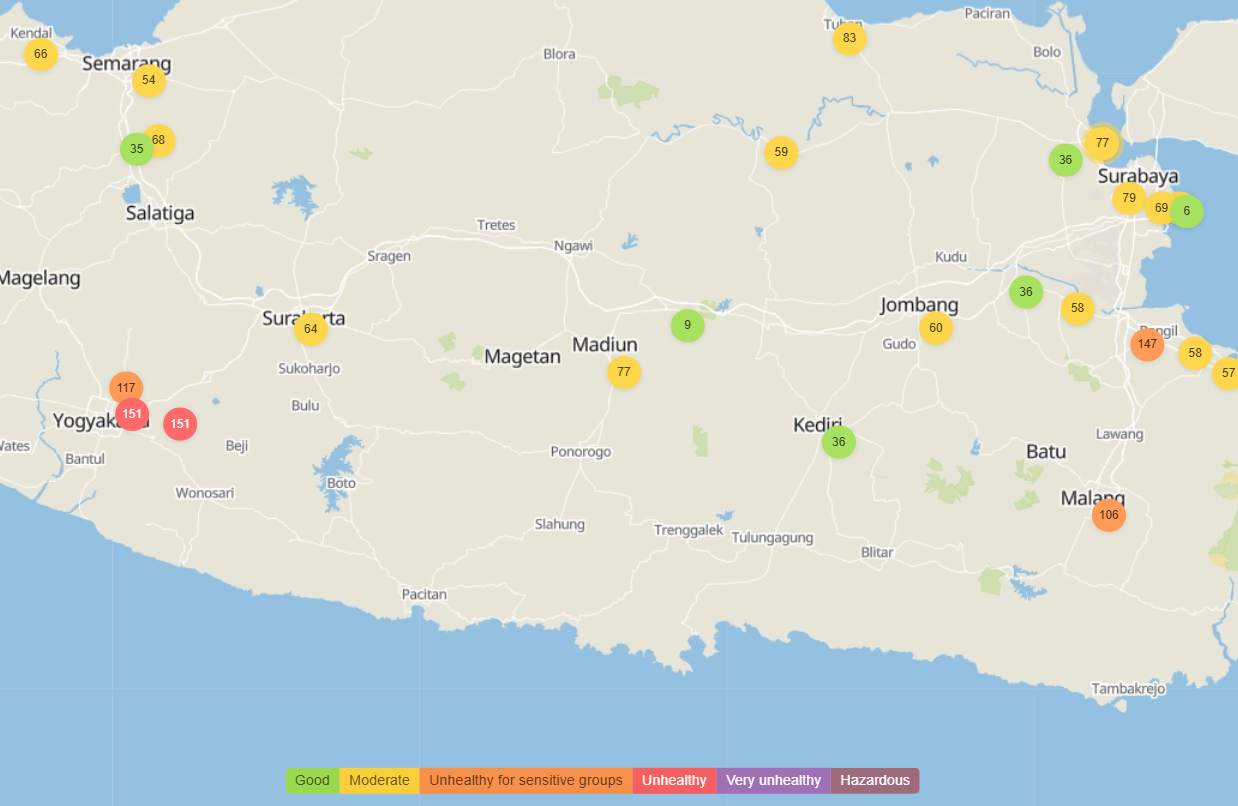 คุณภาพอากาศย่ำแย่ในชวาตะวันออก ประเทศอินโดนีเซีย ที่มา: IQAir.