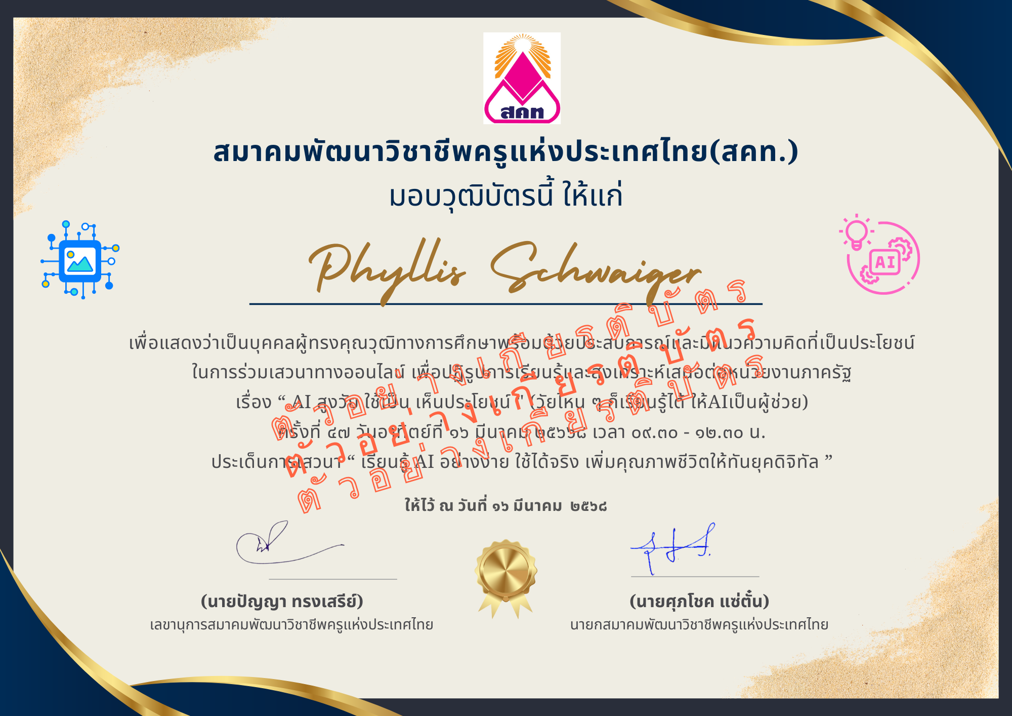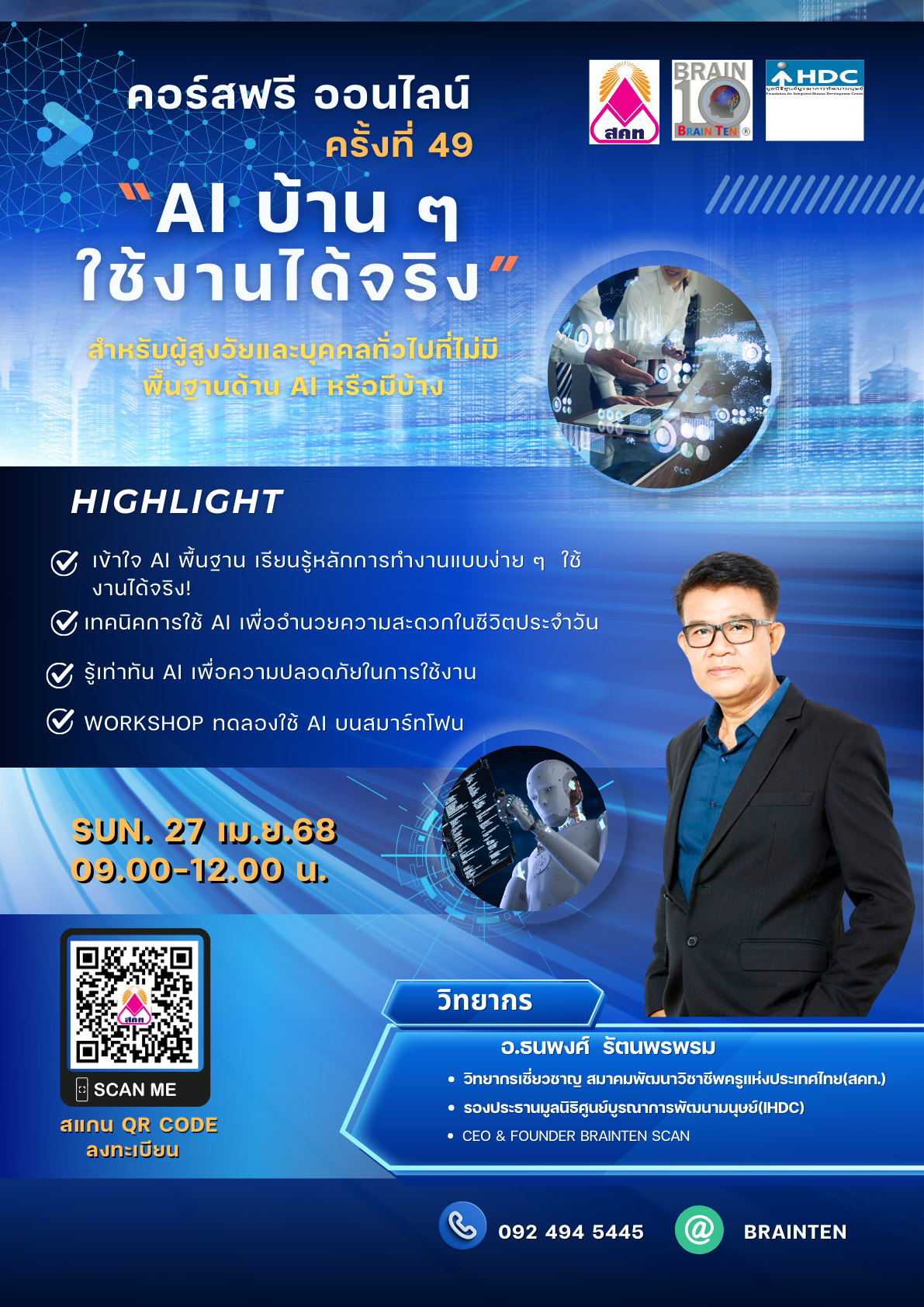 คอร์สอบรมออนไลน์ตัวนี้ออกแบบมาเพื่อคนทั่วไปและผู้สูงวัยที่ ไม่มีพื้นฐานด้าน AI เลย หรือมีแค่นิดหน่อย ก็เรียนได้แบบไม่กดดัน เน้นสอนให้ใช้ได้จริงในชีวิตประจำวัน ไม่ต้องรู้โค้ด ไม่ต้องเก่งคอมพิวเตอร์ก็ไปต่อได้