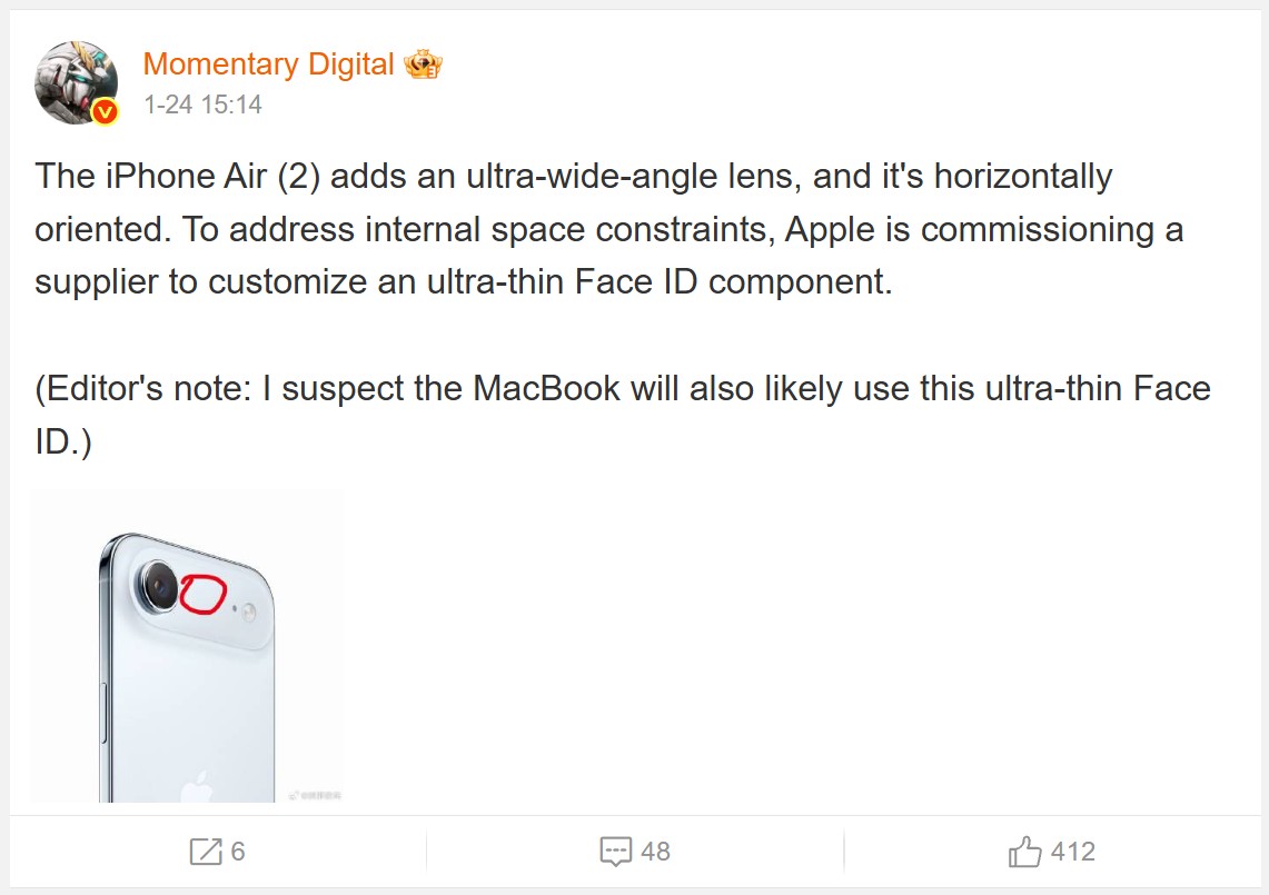 ข้อมูลนี้มาจากแหล่งข่าวบน Weibo ที่ใช้ชื่อว่า Momentary Digital ซึ่งเคยให้ข้อมูลด้านซัพพลายเชนของ Apple มาก่อน โดยระบุว่า iPhone Air 2 จะมีการปรับโครงสร้างภายในครั้งใหญ่ เพื่อรองรับฮาร์ดแวร์ที่เพิ่มเข้ามา โดยเฉพาะชุดกล้องหลัง