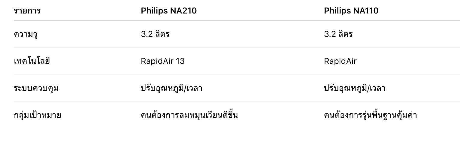 ทั้ง Philips NA210 และ Philips NA110 เป็นหม้อทอดไร้น้ำมันขนาด 3.2 ลิตรที่เหมาะกับครัวขนาดเล็กถึงกลาง ให้ผลลัพธ์กรอบอร่อยใกล้เคียงกันในระดับหนึ่ง