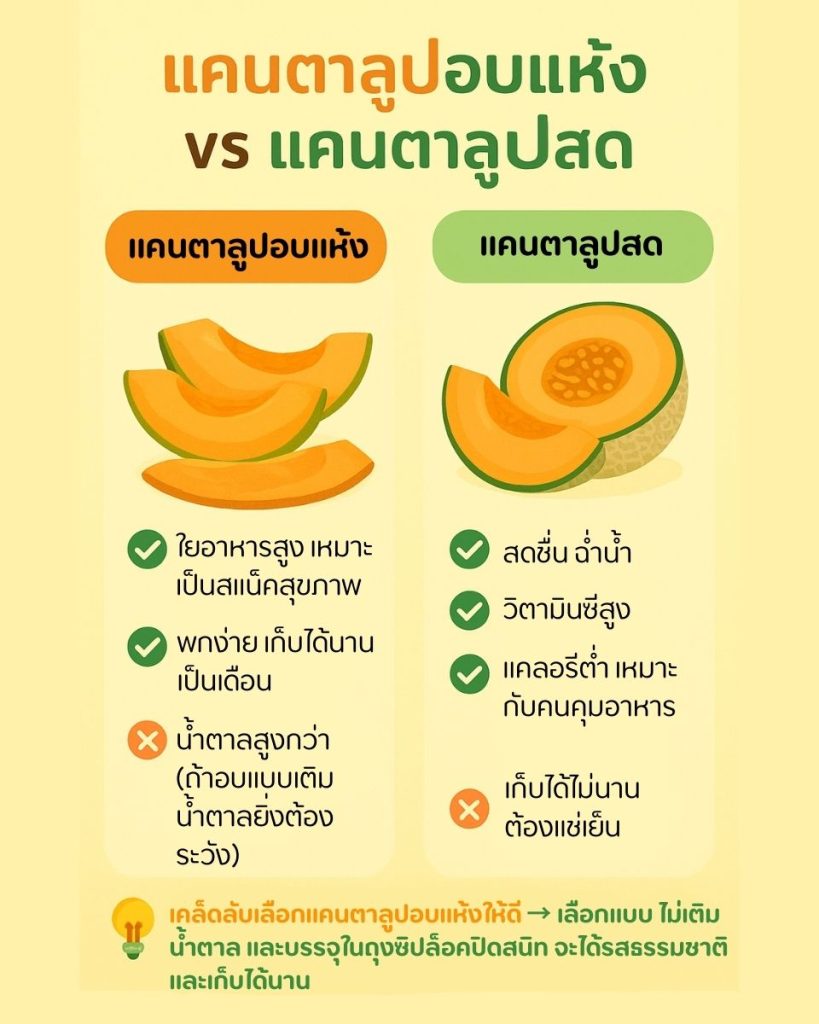 → เลือกแคนตาลูปสดเป็นหลักถ้าต้องการ ความสะดวก พกง่าย เก็บได้นาน