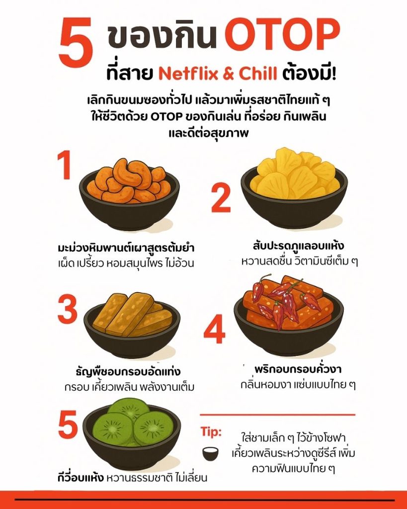 ยุคนี้การดูซีรีส์ยาว ๆ ไม่จำเป็นต้องพึ่งขนมซองอุตสาหกรรมที่กินแล้วรู้สึกผิดอีกต่อไป เพราะ OTOP กลายเป็นตัวเลือกใหม่ที่ตอบโจทย์ทั้ง รสชาติ สุขภาพ ความสนุก และเสน่ห์แบบไทยแท้