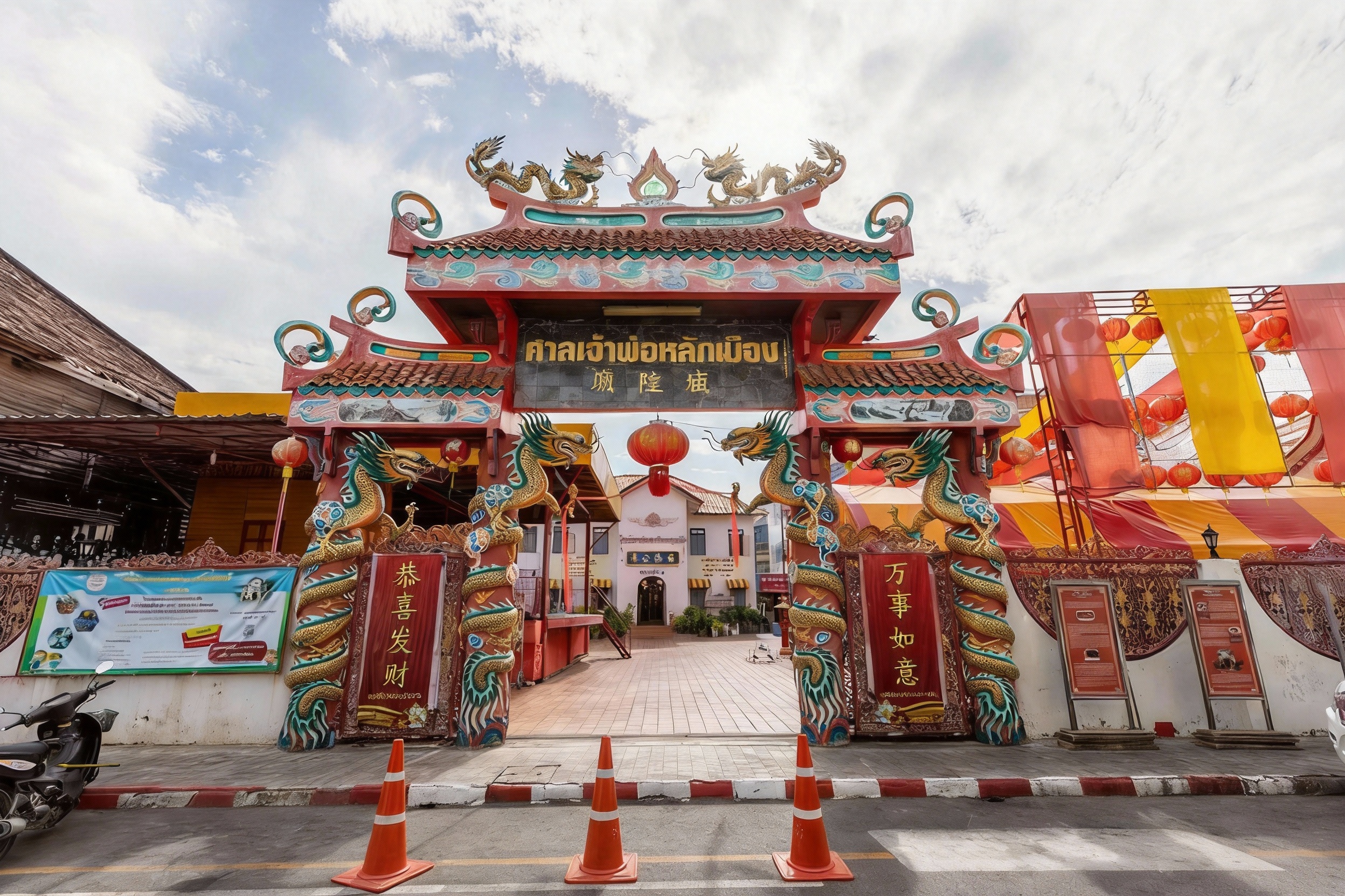 จากนั้นค่อยเดินย้อนกลับมาที่ศาลเจ้า บรรยากาศแบบเก๋งจีนคลาสสิก ภายในมีเสาหลักเมืองตามคติพราหมณ์ ผสมกับเทวรูปและเทพเจ้าศักดิ์สิทธิ์ตามความเชื่อแบบจีน เรียกว่ามาที่เดียว ได้ขอพรแบบครบสาย
