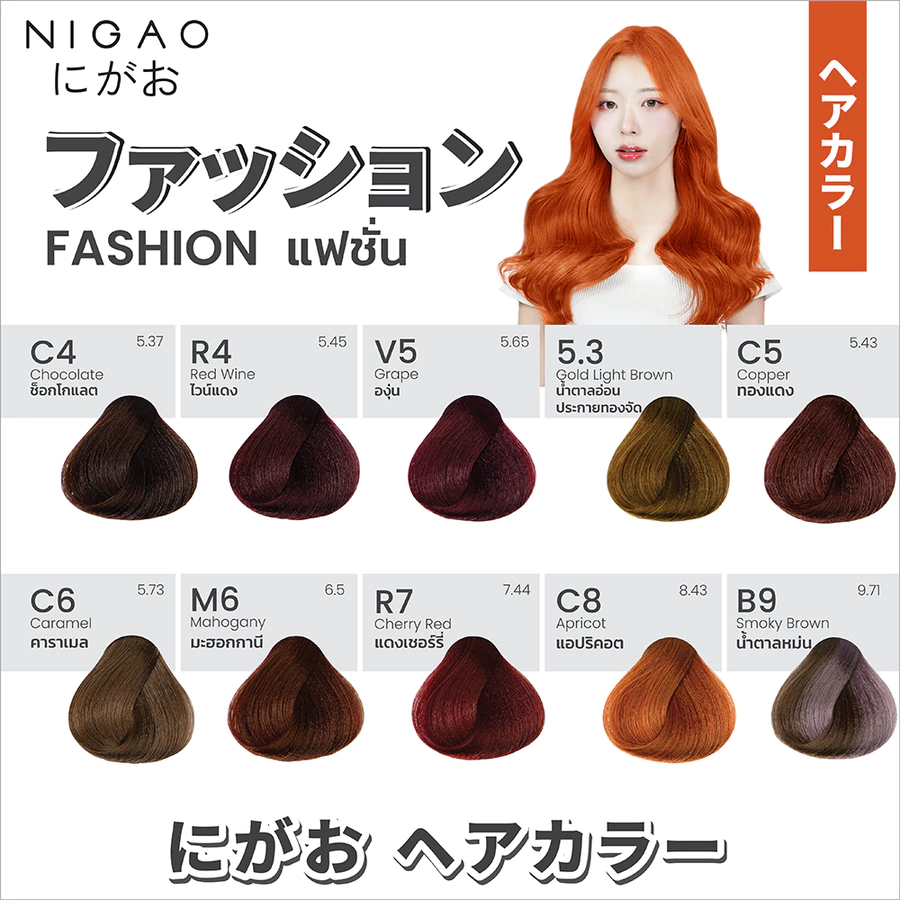 เฉดสีของ Nigao มีตั้งแต่โทนธรรมชาติไปจนถึงสีแฟชั่น เช่น