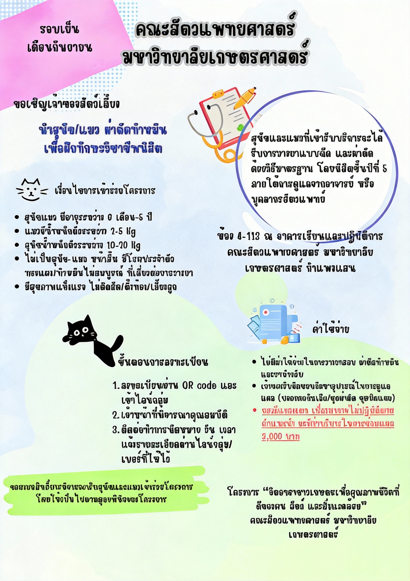 คณะสัตวแพทย์ มหาวิทยาลัยเกษตรศาสตร์ วิทยาเขตกำแพงแสน เปิดโครงการทำหมันสุนัขและแมว เชิญเจ้าของสัตว์เลี้ยงพาเพื่อนสี่ขามาร่วมรับการผ่าตัดทำหมัน ภายใต้การดูแลของทีมสัตวแพทย์และนิสิตสัตวแพทยศาสตร์