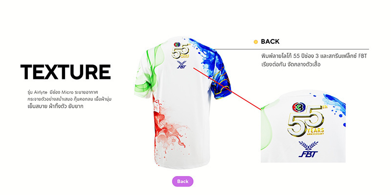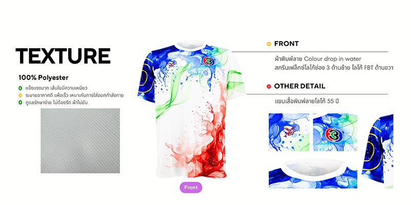 ด้านหลัง : พิมพ์ลายโลโก้ 55 ปี ช่อง 3 และสกรีนเฟล็กซ์ FBT เรียงต่อกัน จัดวางกลางตัวเสื้ออย่างโดดเด่น