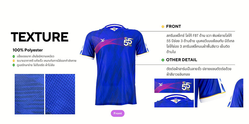ด้านหน้า : สกรีนเฟล็กซ์โลโก้ FBT ด้านขวา พิมพ์ลายโลโก้ 55 ปี ช่อง 3 ด้านซ้าย คอวีดีไซน์ซ้อนทับเหมือนแบบสีน้ำเงิน พร้อมดีเทลโลโก้ช่อง 3 สกรีนเฟล็กซ์บนผ้าพื้นสีขาว เย็บติดด้านใน เติมความเนี้ยบแบบสปอร์ต
