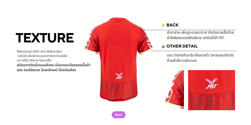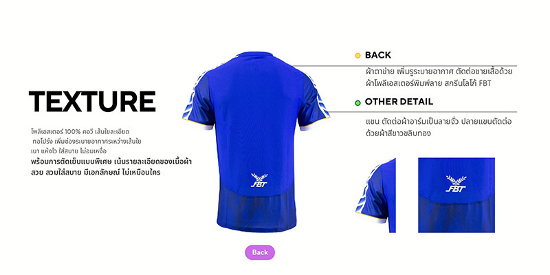 ด้านหลัง : ใช้ผ้าตาข่ายเพิ่มรูระบายอากาศ ใส่นานก็ยังสบาย ตัดต่อชายเสื้อด้วยผ้าโพลีเอสเตอร์พิมพ์ลาย พร้อมสกรีนโลโก้ FBT เพิ่มความสปอร์ต