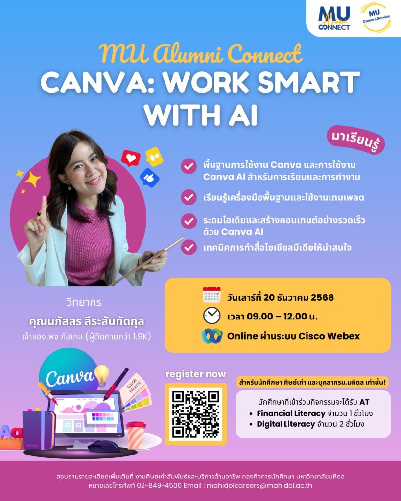 กิจกรรม MU Alumni Connect หัวข้อ “Canva: Work smart with AI” ชวนทั้งนักศึกษาและศิษย์เก่ามหิดลมาเรียนรู้การออกแบบแบบมือใหม่ก็ทำได้ คนทำงานก็เอาไปใช้ต่อยอดจริง