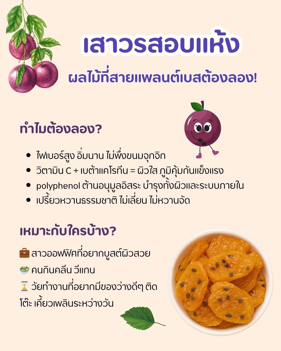 ถ้ามองให้ลึกกว่าความเป็น “ขนม” เสาวรสอบแห้งคือพลังจากธรรมชาติที่ถูกย่อส่วนให้พกง่าย กินสะดวก และเข้ากับชีวิตยุคใหม่แบบไม่ต้องพยายามมาก