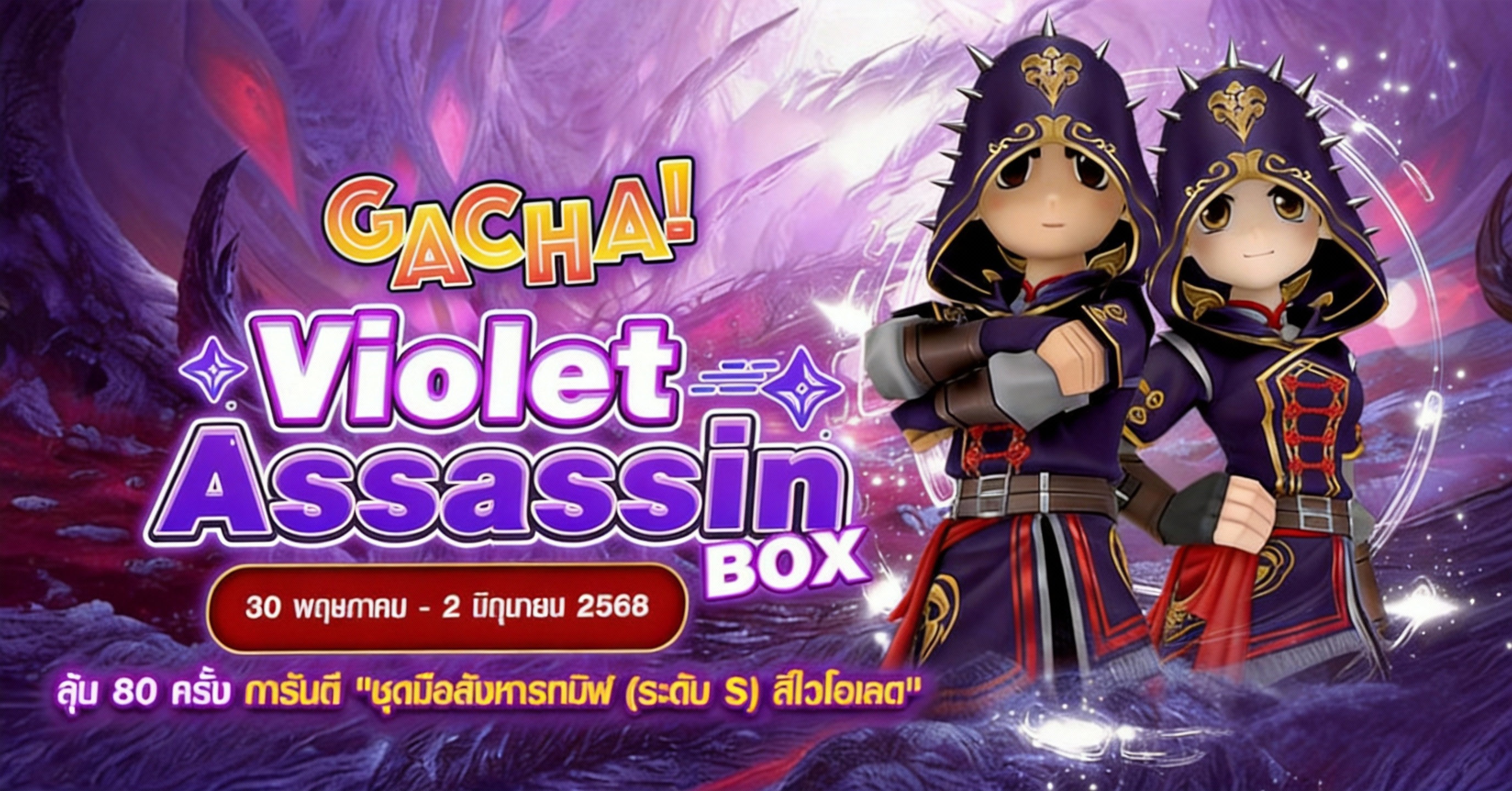 “Violet Assassin Box” เป็นกล่อง GACHA ราคา 50 บาท ที่ให้ผู้เล่นได้ลุ้นของรางวัลต่าง ๆ ภายในเกม