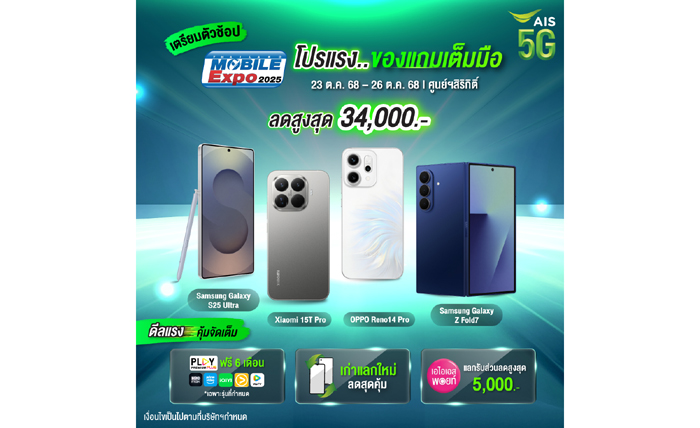 เอไอเอสเดินเกมใหญ่ตอกย้ำภาพผู้นำดิจิทัลไลฟ์สไตล์แบบครบวงจร ยกขบวนสมาร์ทโฟนและแก็ดเจ็ตมาจัดโปรโมชั่นแรงส่งท้ายปีในงาน Thailand Mobile Expo 2025 ที่บูธ PL10 ศูนย์การประชุมแห่งชาติสิริกิติ์