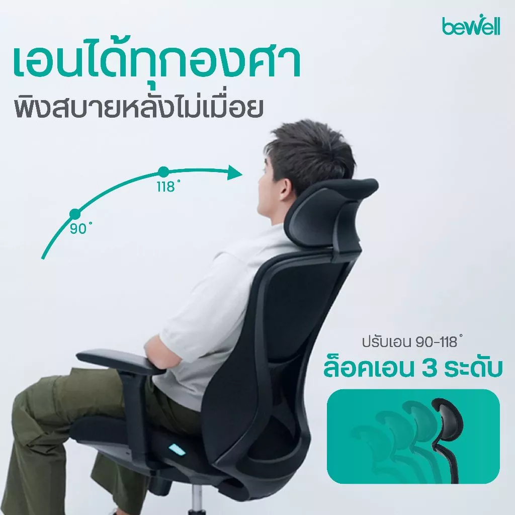 Bewell ออกแบบเก้าอี้ตามหลักสรีรศาสตร์ชัดเจน เน้น Lumbar Support ปรับได้หลายมิติ ที่วางแขน 3D/4D พนักพิงเอนได้หลายองศา และวัสดุระบายอากาศดี