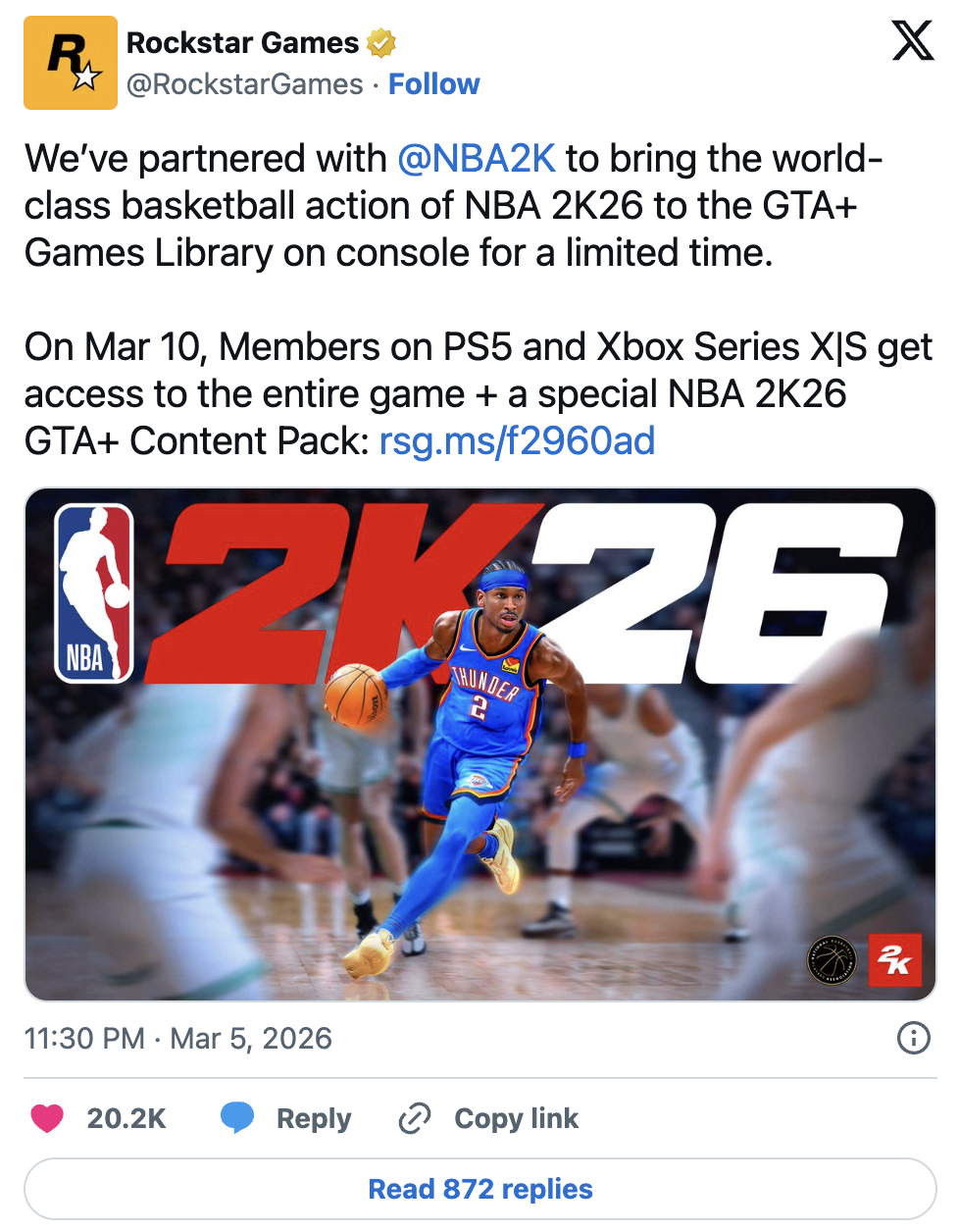Rockstar เตรียมเพิ่มเกม NBA 2K26 ลงในสิทธิ์ของสมาชิก GTA+ โดยผู้สมัครสมาชิกบน PS5 และ Xbox Series X|S จะสามารถเล่นเกมเต็มได้ตั้งแต่ 10 มีนาคม ถึง 20 เมษายน 2026
