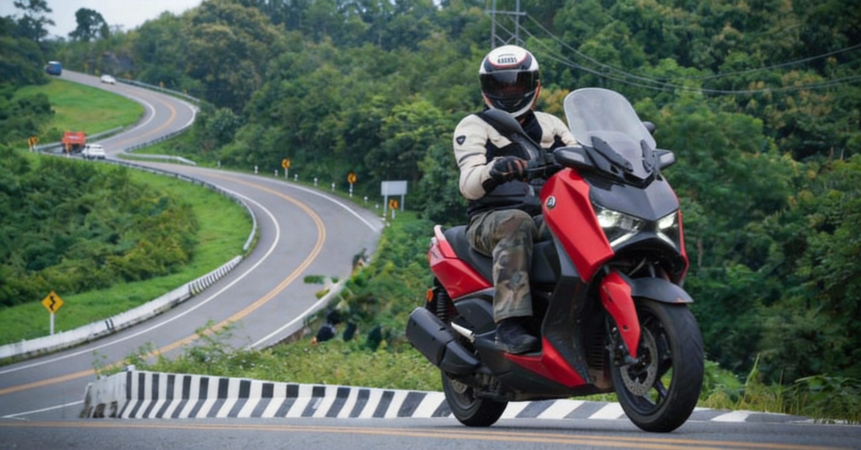 จากพิษณุโลกมุ่งหน้าอุตรดิตถ์ต่อด้วยแพร่ ช่วงจังหวัดแพร่เจอฝนเทลงมายาวๆ มืดก็แล้ว โค้งก็เยอะ แถมฝนหนัก เลยต้องลดความเร็วลงพอสมควร แต่ Yamaha XMAX ก็พาผมและผู้ซ้อนผ่านทุกอุปสรรคมาถึงเมืองน่านได้แบบสบายใจ