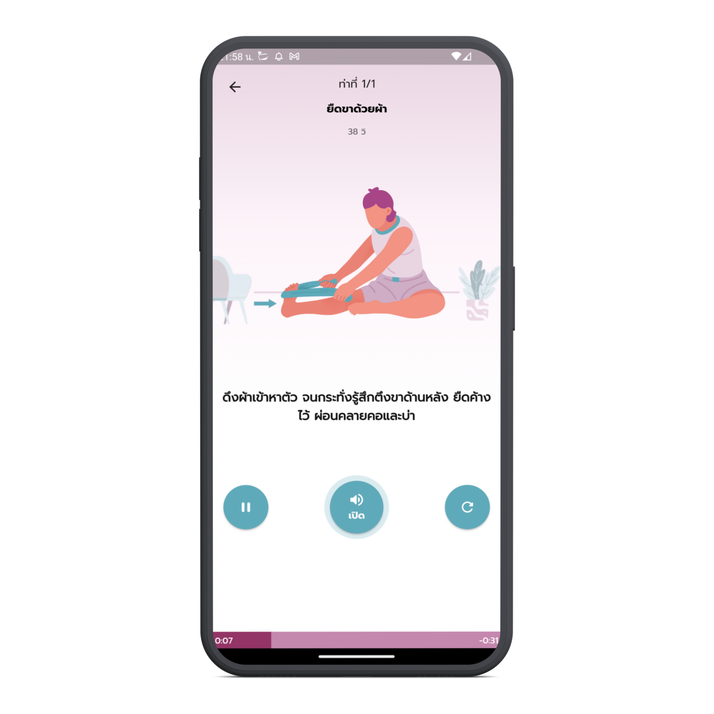 ดึงผ้าขนหนูเข้าหาตัว จนรู้สึกตึงบริเวณขาด้านหลัง ขณะยืดให้ผ่อนคลายคอและบ่า ไม่เกร็งไหล่