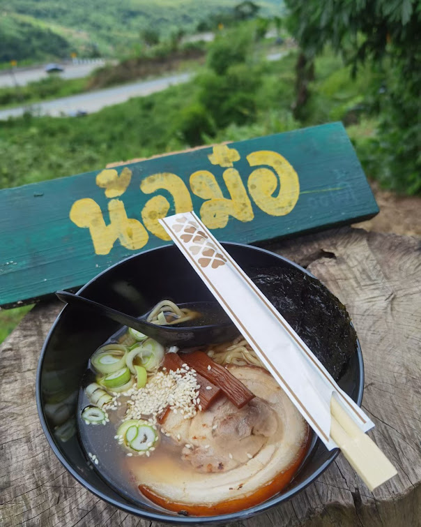 พอขึ้นมาถึงภูทับเบิกได้ช่วงเที่ยงๆ ก็แวะหาอะไรร้อนๆ กินกันที่คาเฟ่บรรยากาศดี “น้อม๋อ คาเฟ่”