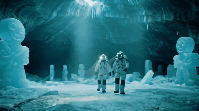 A wide, slow-panning shot of an enormous glacial cavern, bathed in eerie twilight. Pale cyan light filters from above, illuminating frozen candy figures within the ice walls. Two figures in white exosuits, their helmet lights casting beams, trudge through the center. Capture the cavern’s scale and stillness.