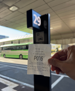 ให้ไปยืนรอตรงป้ายที่บริษัทแจ้งไว้ ซึ่งจะมี หมายเลขป้ายและตารางเวลารถวิ่งชัดเจน
