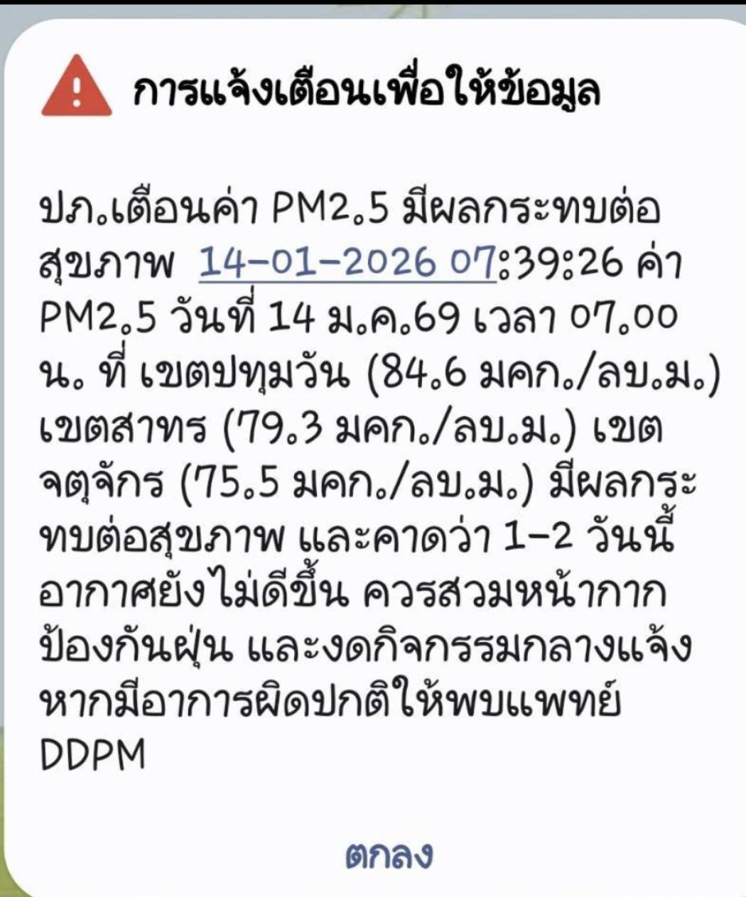 เมื่อประชาชน เดินทางเข้าสู่พื้นที่ที่มีค่าฝุ่นระดับสีแดง จะได้รับข้อความแจ้งเตือนอัตโนมัติบนมือถือ เพื่อให้