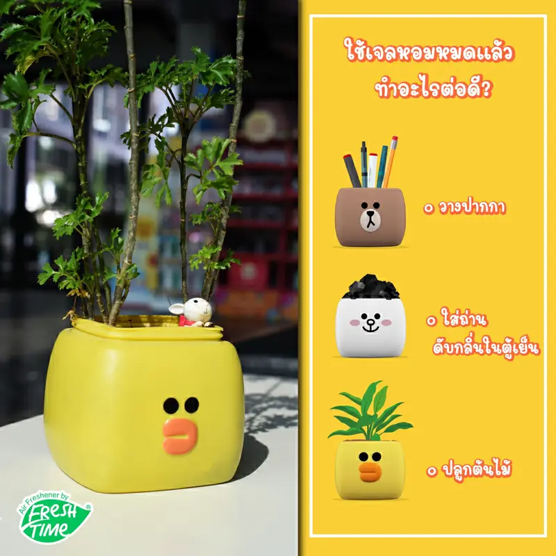 หนึ่งในคอลแลบที่ทำออกมาได้น่าสนใจมาก คือ FreshTime x LINE FRIENDS เจลหอมปรับอากาศ 155g. เพราะนี่ไม่ใช่แค่น้ำหอมปรับอากาศธรรมดา แต่เป็นการเอาคาแรกเตอร์แต่ละตัวมาแทน “กลิ่น” ที่สะท้อนบุคลิกแบบชัดเจน