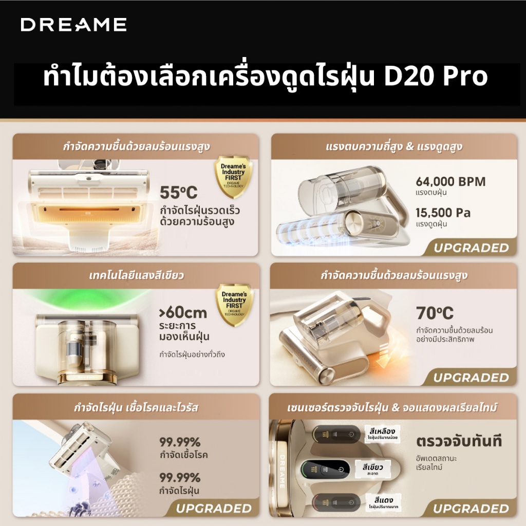Dreame D20 Pro Mite Remover คือ เครื่องดูดไรฝุ่นประสิทธิภาพสูง ที่ออกแบบมาเพื่อทำความสะอาดพื้นผิวผ้า เช่น ที่นอน โซฟา หมอน หรือเบาะต่างๆ โดยเน้นการกำจัดไรฝุ่น แบคทีเรีย และสารก่อภูมิแพ้ที่ฝังลึกอยู่ในเนื้อผ้า
