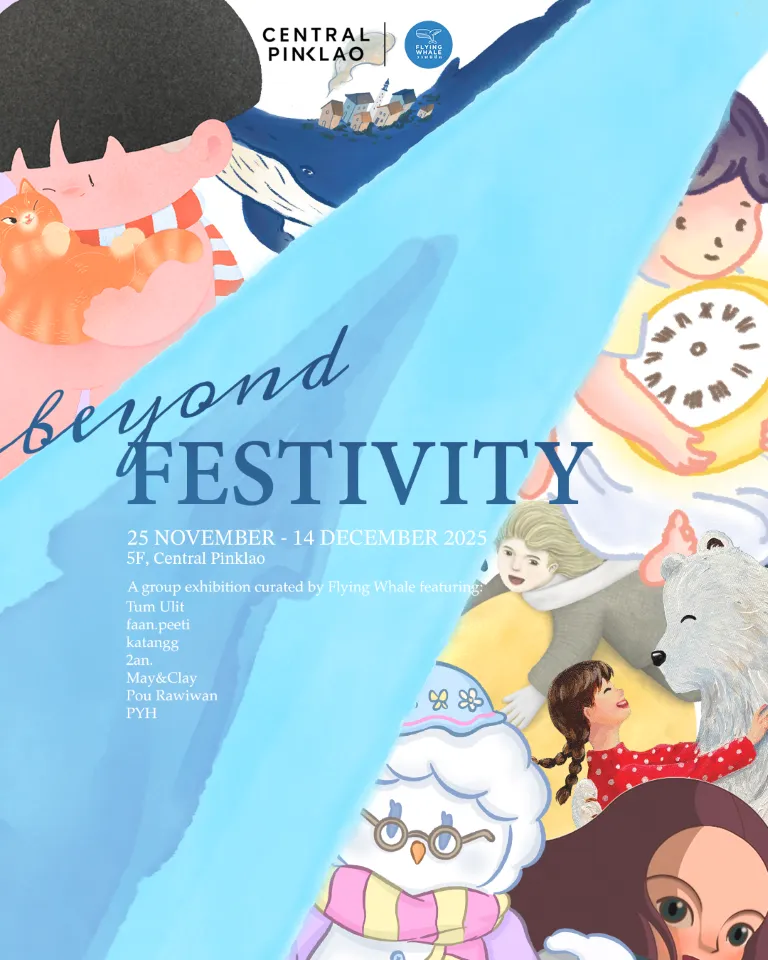 Beyond Festivity เป็นนิทรรศการกลุ่มที่วาฬมีปีกรับหน้าที่คัดสรรและดูแลการจัดแสดงอย่างครบวงจร โดยเชิญศิลปินและนักวาดภาพประกอบ 7 คนมาสร้างสรรค์ผลงานใหม่ทั้งหมด แต่ละชิ้นเล่าเรื่องผ่านลายเส้นและภาษาภาพที่ดูง่าย แต่ซ่อนความรู้สึกและความคิดลึก ๆ ไว้แบบน่าค้นหา