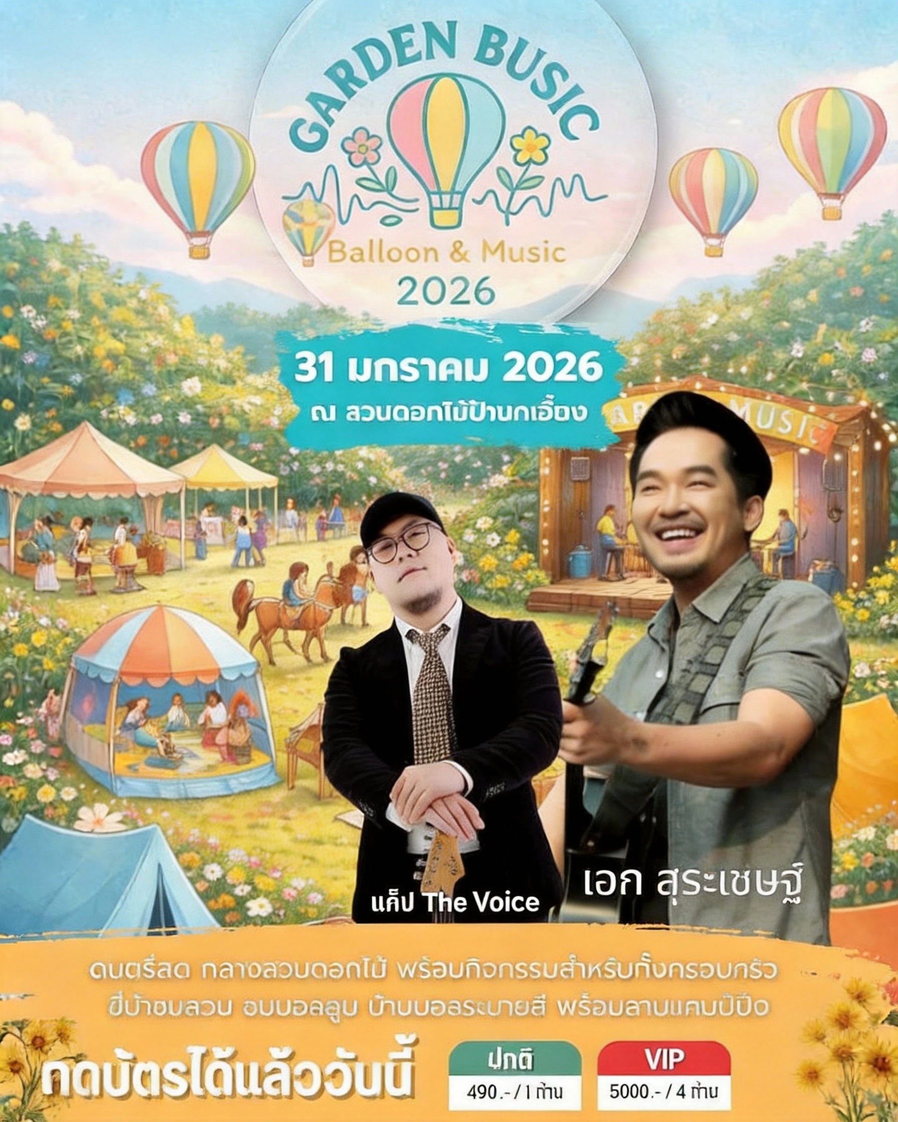 ถ้าคุณกำลังมองหาที่พักใจในหน้าหนาว เช็คอินท่ามกลางดอกไม้ ฟังเพลงสด ฟีลดี ๆ และยังได้บรรยากาศคล้ายตั้งแคมป์พักค้างท่ามกลางธรรมชาติ Garden Busic Balloon & Music 2026 คือหนึ่งในกิจกรรมที่ไม่ควรหลุดโผลิสต์เที่ยวเชียงใหม่ฤดูกาลนี้เลย