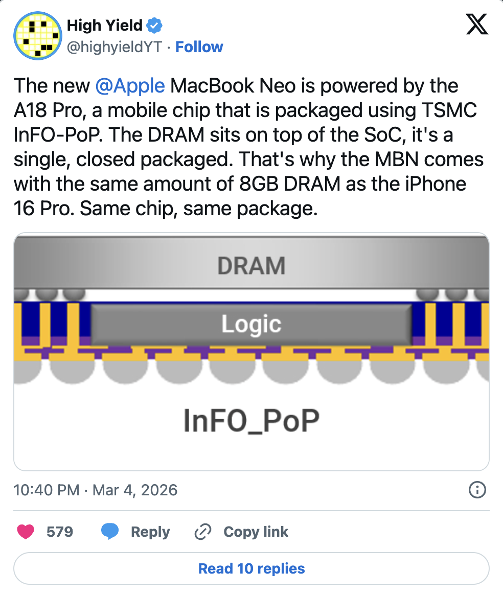 อย่างไรก็ตาม ข้อมูลใหม่ระบุว่า ข้อจำกัดของ RAM ใน MacBook Neo ไม่ได้เกิดจากการที่ Apple ลดต้นทุนแบบตั้งใจ แต่เกิดจาก วิธีการออกแบบชิป A18 Pro ที่ใช้เทคโนโลยีการแพ็กเกจแบบพิเศษของ TSMC ทำให้หน่วยความจำถูกติดตั้งรวมอยู่กับตัวชิปตั้งแต่ต้น