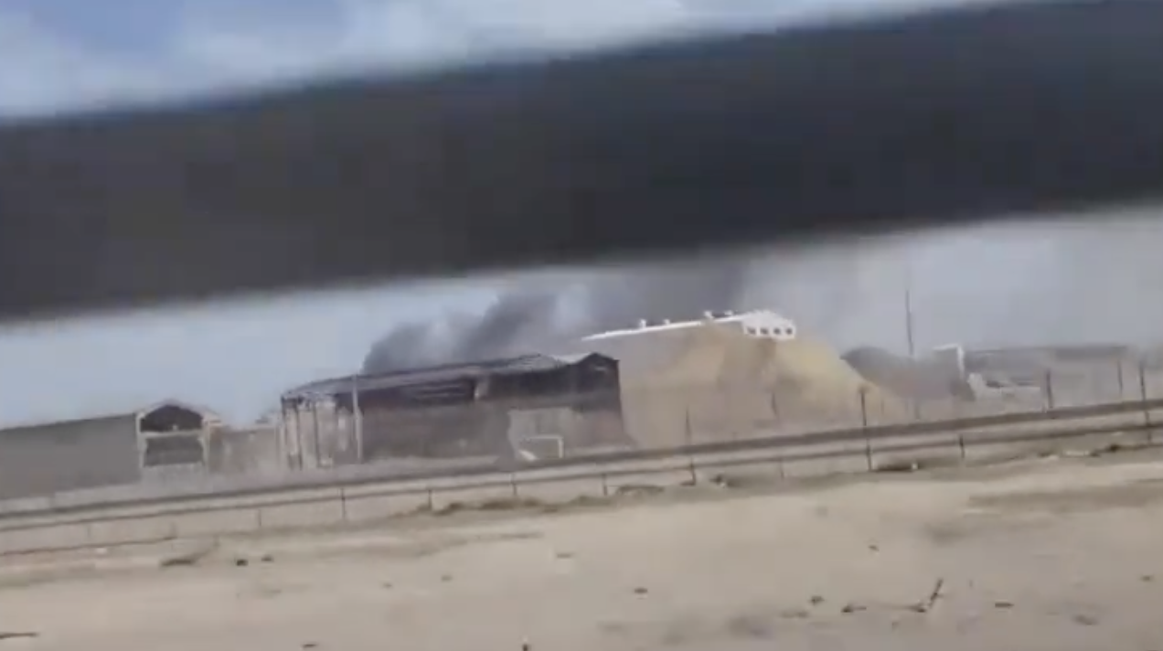 ภาพถ่ายดาวเทียมแสดงให้เห็นอาคารถูกไฟไหม้และมีควันดำลอยขึ้นจากพื้นที่ท่าเรือ