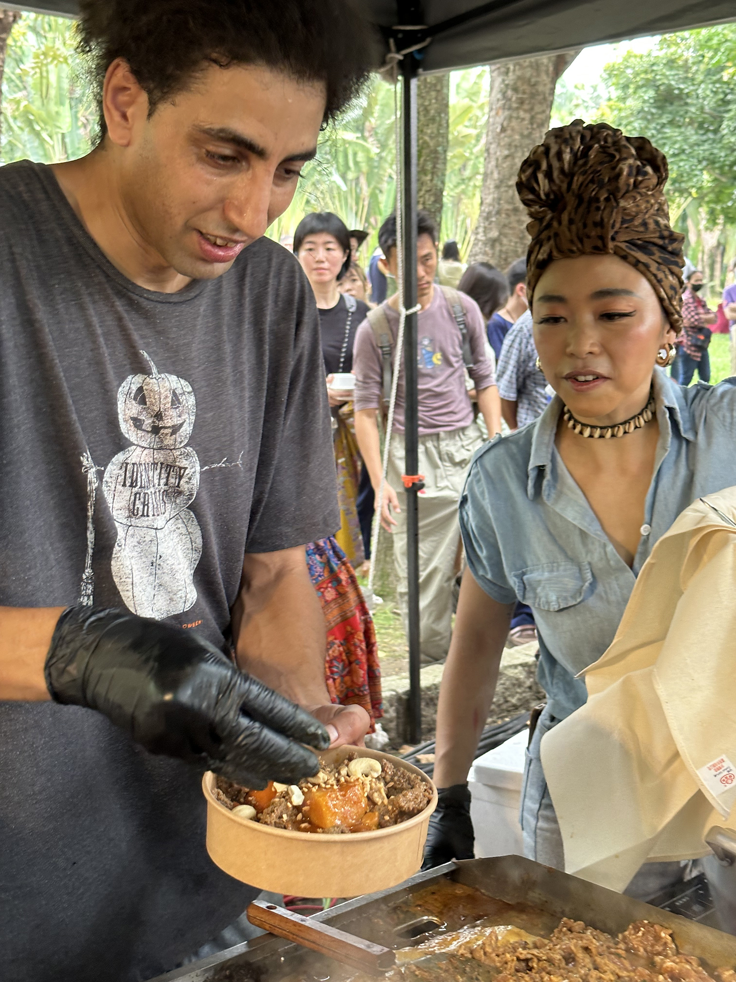 เช้าตรู่มีชาวมุสลิมแต่งกายสวยงามหลั่งไหลมาร่วมงาน บรรยากาศเต็มไปด้วยสีสันและรอยยิ้ม แผงอาหารฮาลาลเรียงราย ผู้คนต่อคิวยาวเหยียด ทั้งครอบครัวและกลุ่มเพื่อนมาปิกนิกบนสนามหญ้า พูดคุย หัวเราะ แลกเปลี่ยนเรื่องราวกันอย่างเป็นกันเอง ขณะที่เวทีอีกฝั่งเต็มไปด้วยเสียงเพลงและการเต้นรำฉลองวันออกบวช