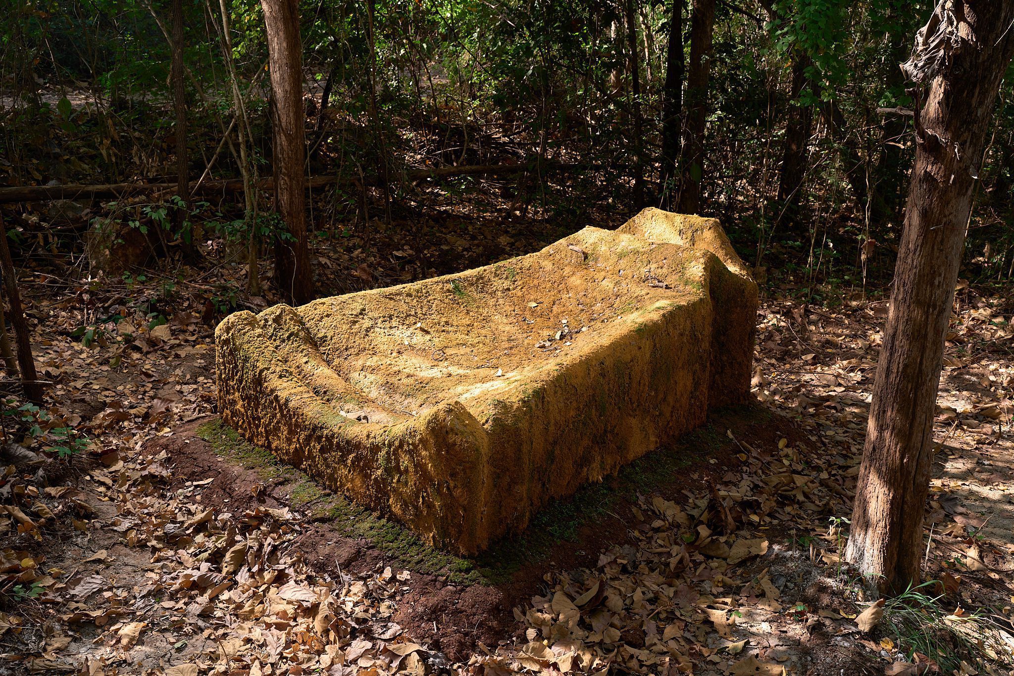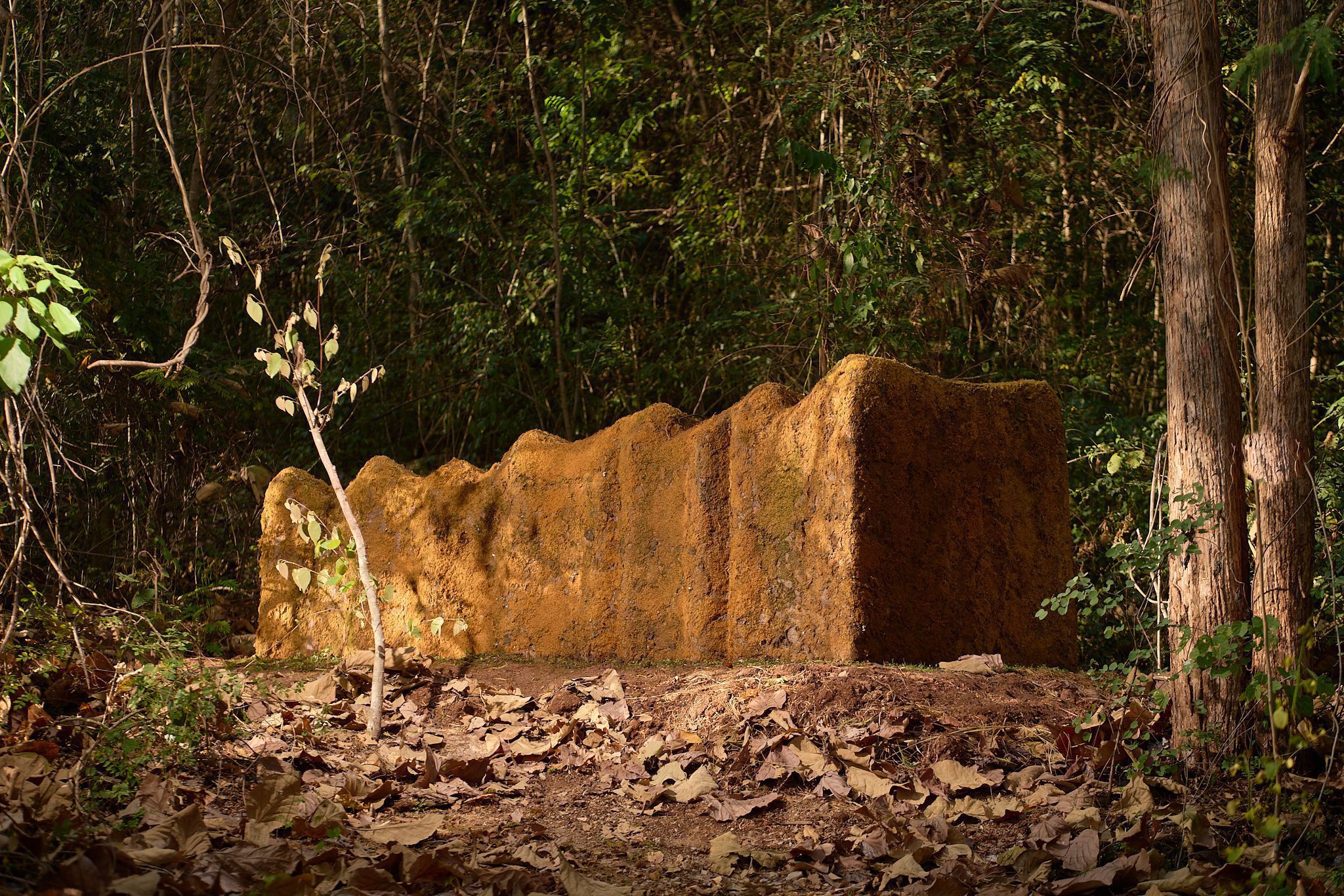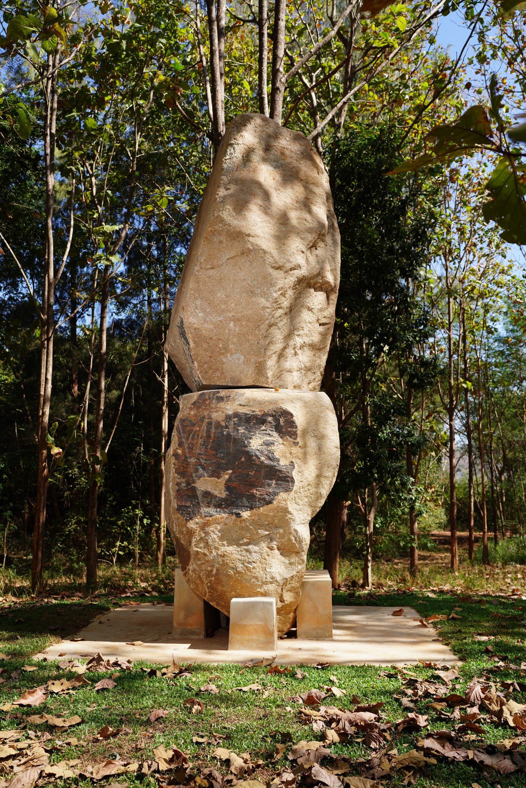 ทีมงานท้องถิ่นเป็นผู้ช่วยติดตั้งก้อนหินขนาดมหึมาให้ซ้อนทับกันท่ามกลางป่าต้นสัก กลายเป็นเสาแห่งการดำรงอยู่ที่ตั้งโดดเด่นอยู่ในความเงียบและร่มเงาของป่า