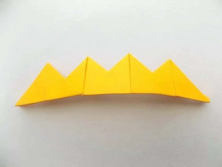 พับขอบของแถบส่วนล่างขึ้นให้แนบกับรูปสามเหลี่ยม ทำทั้งสองฝั่งให้เท่ากัน