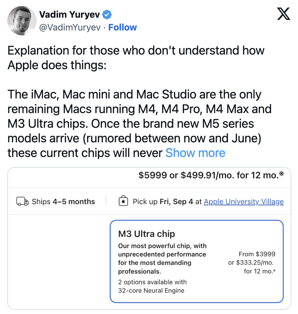 รายงานระบุว่า Apple เริ่มทำการ Phase out หรือลดกำลังการผลิตผลิตภัณฑ์ที่ใช้ชิปตระกูล M4 (รวมถึง M4 Pro, M4 Max และ M3 Ultra ใน Mac Studio) อย่างจงใจ: