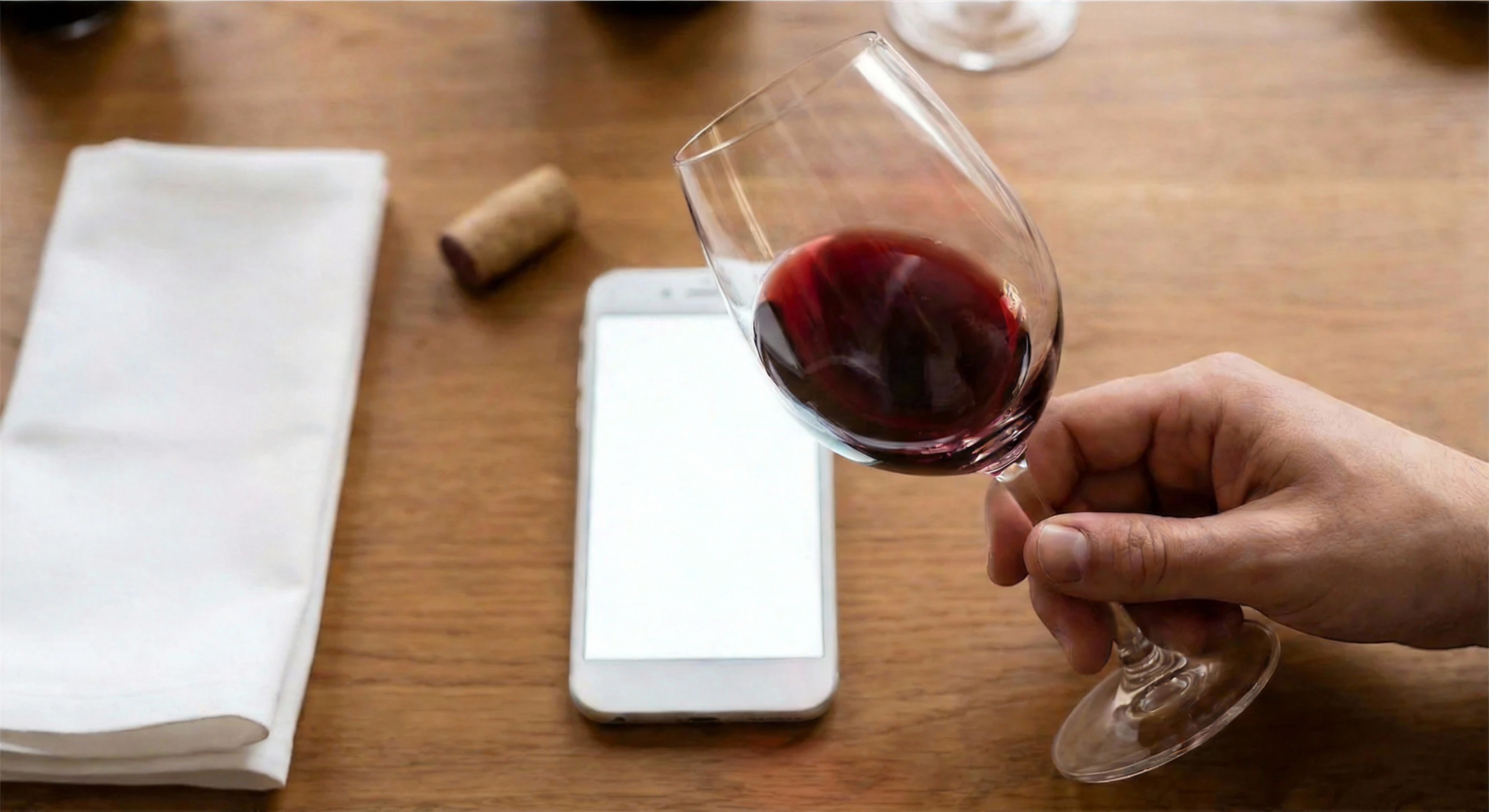 เอียงแก้วไวน์เล็กน้อยบนพื้นหลังสีขาวสะอาด เช่น กระดาษทิชชู่ หรือหน้าจอมือถือที่เปิดภาพสีขาวล้วน