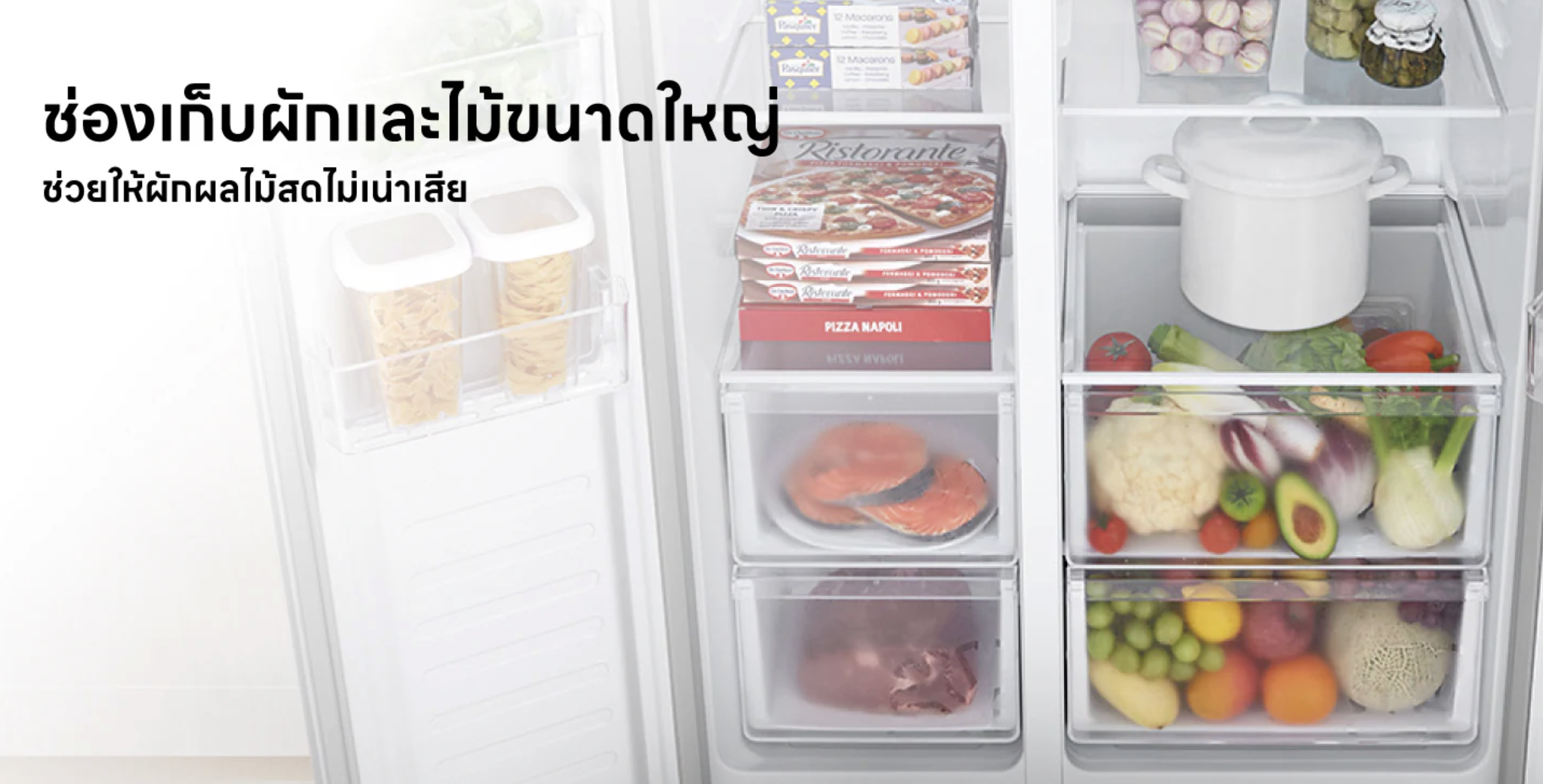 หนึ่งในจุดเด่นสำคัญของรุ่นนี้คือความจุที่รองรับได้มาก ทำให้เหมาะกับบ้านที่มีสมาชิกหลายคน หรือบ้านที่ต้องการพื้นที่จัดเก็บอาหารและวัตถุดิบจำนวนมาก ช่องแช่เย็นและช่องแช่แข็งถูกแบ่งฝั่งกันอย่างเป็นระเบียบ ช่วยให้การจัดของเป็นเรื่องง่ายขึ้น ไม่ต้องซ้อนทับจนมองหาไม่เจอ สามารถแยกหมวดหมู่อาหารสด อาหารแช่แข็ง เครื่องดื่ม และผักผลไม้ได้อย่างชัดเจน