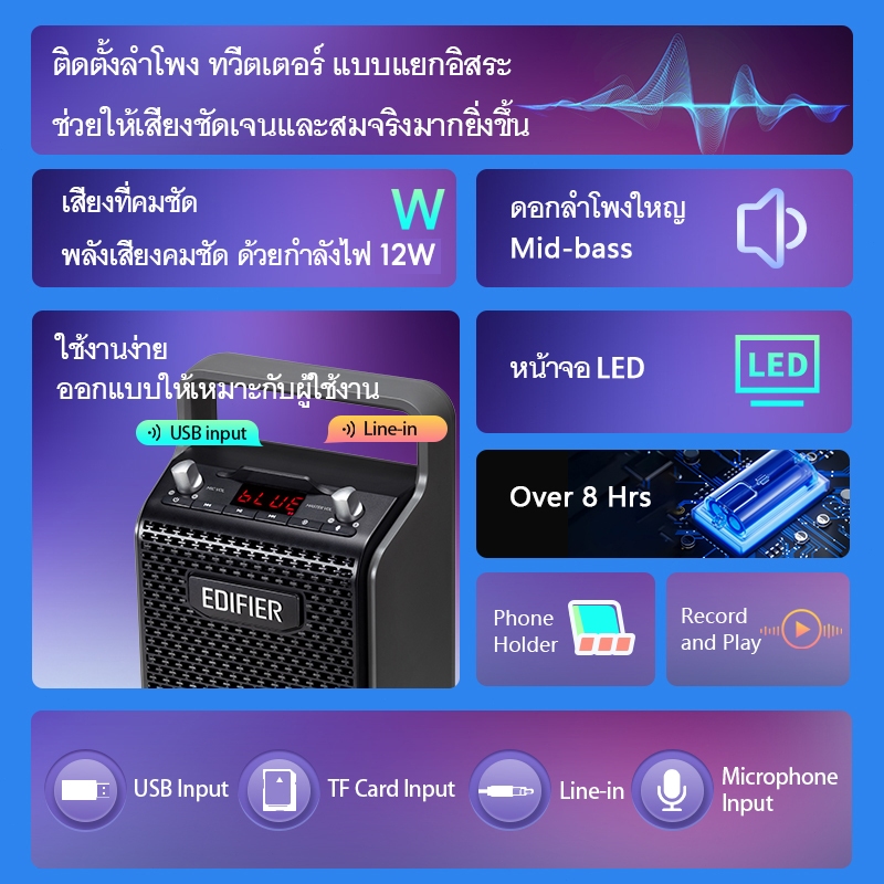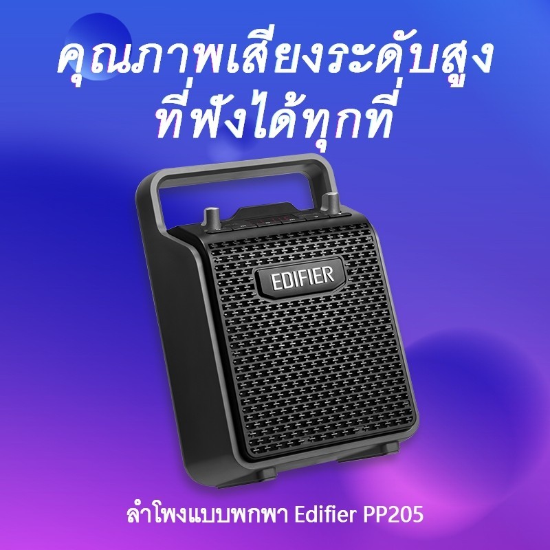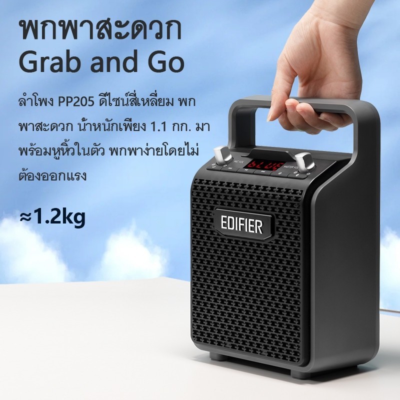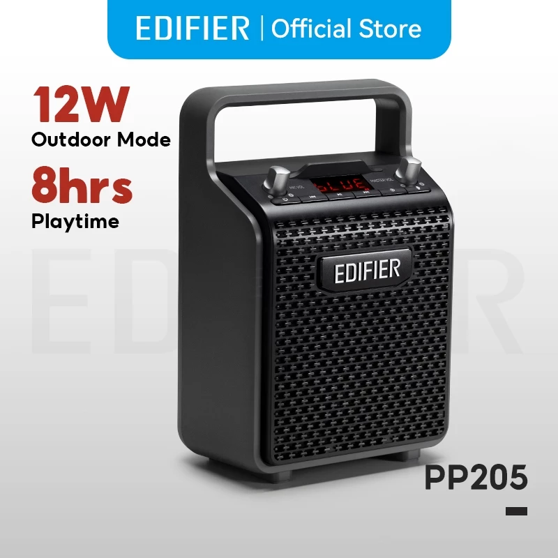 Edifier PP205 เป็นลำโพงคาราโอเกะแบบพกพาที่รองรับ Bluetooth 5.0 มีหน้าจอ LED แสดงสถานะ และแบตเตอรี่ในตัวที่ใช้งานต่อเนื่องได้นานกว่า 8 ชั่วโมง