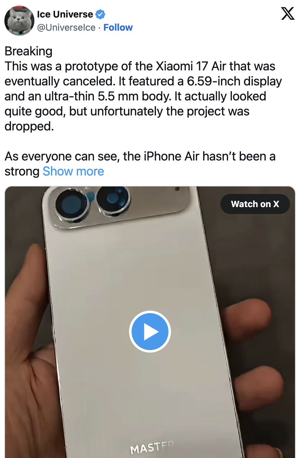 Ice Universe ระบุว่า มือถือแนว Xiaomi 17 Air อาจถูกชุบชีวิตกลับมาอีกครั้ง “ในเวลาที่เหมาะสม” เพราะในปัจจุบัน ผู้ผลิตยังต้องยอมแลกหลายอย่างมากเกินไป เพื่อให้ได้ดีไซน์ที่บางสวย