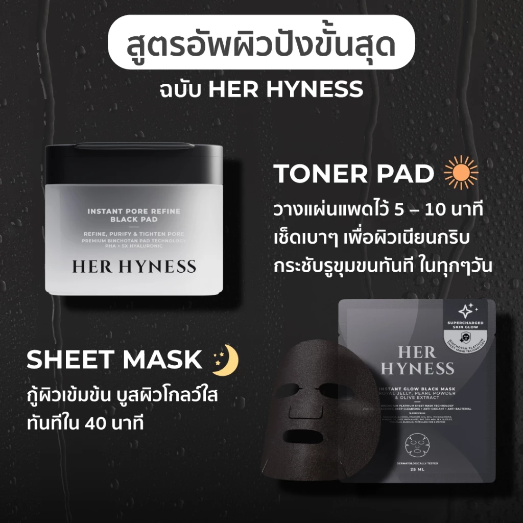 แต่ความพิเศษของ HER HYNESS INSTANT PAD ทั้ง 2 สูตร คือการผสาน “เทคโนโลยีแผ่นขั้นสูง” เข้ากับ SUPER SERUM สูตรเข้มข้น ทำให้ไม่ได้แค่เติมน้ำผิว แต่ตอบโจทย์เฉพาะทางชัดเจนใน 10 นาที