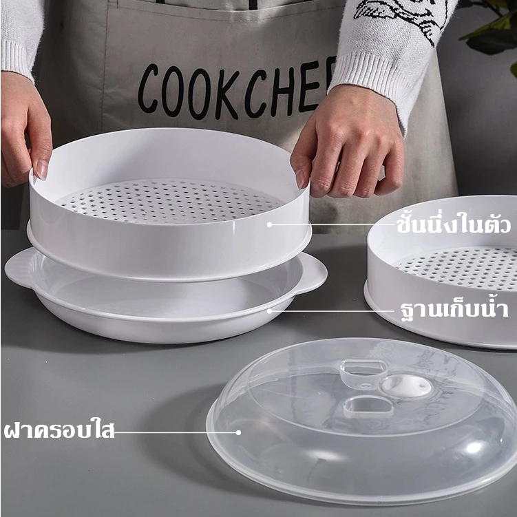 หลักการทำงานคือ เมื่อใส่น้ำในส่วนล่างและเปิดไมโครเวฟ น้ำจะกลายเป็นไอน้ำและลอยขึ้นไปทำให้อาหารสุกหรือร้อนอย่างทั่วถึง คล้ายการนึ่งแบบดั้งเดิม แต่รวดเร็วกว่า