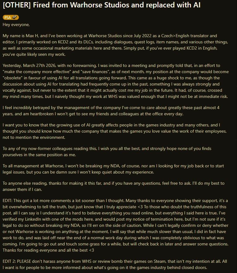 AI แทนงาน กำลังกลายเป็นประเด็นที่ถูกพูดถึงมากขึ้นในหลายอุตสาหกรรม รวมถึงวงการเกม หลังมีกรณีของอดีตพนักงานจาก Warhorse Studios ผู้พัฒนา Kingdom Come: Deliverance ออกมาเล่าว่าถูกเลิกจ้าง และตำแหน่งของเขาถูกแทนที่ด้วยระบบ AI สำหรับงานแปลภาษา