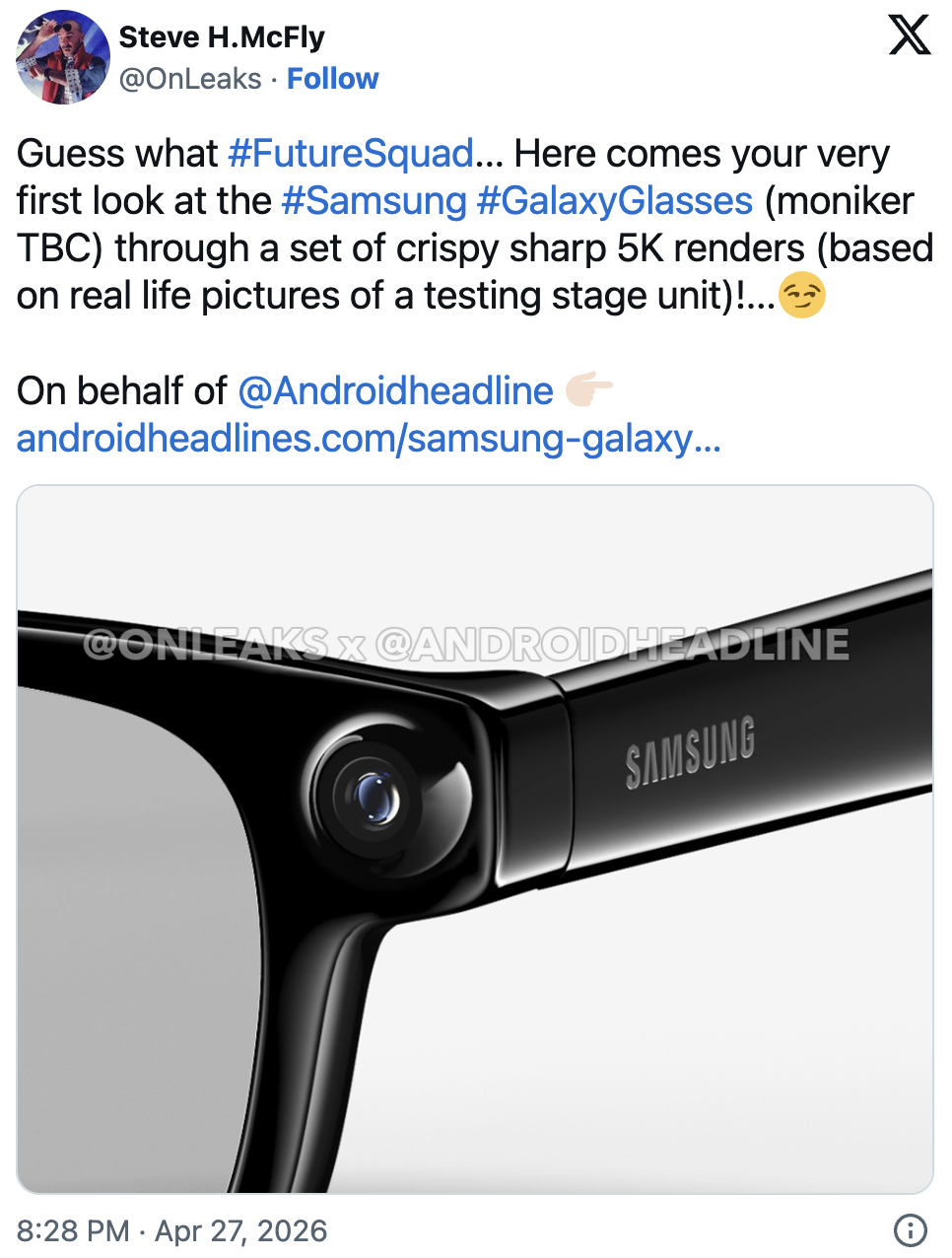 วงการ Wearable ปี 2569 กำลังจะเปลี่ยนไปครับ เมื่อล่าสุดเว็บไซต์ Wccftech (27 เมษายน 2569) ได้เผยภาพเรนเดอร์แรกของ Samsung Galaxy Glasses (รหัสพัฒนา Jinju) ซึ่งเป็นแว่นตาอัจฉริยะรุ่นแรกของค่ายที่เน้นความเบาและพลังของ AI โดยดีไซน์มีความคล้ายคลึงกับแว่น Ray-Ban Meta ที่ครองตลาดอยู่ขณะนี้ แต่เสริมทัพด้วย Ecosystem ของ Google และ Samsung ที่แข็งแกร่งกว่าครับ