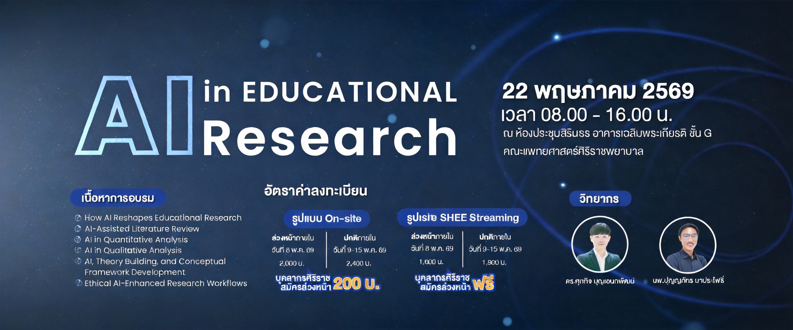 จากความสำคัญของทั้ง AI และการวิจัยทางการศึกษา ศูนย์ความเป็นเลิศด้านการศึกษาวิทยาศาสตร์สุขภาพ ฝ่ายการศึกษา คณะแพทยศาสตร์ศิริราชพยาบาล จึงจัดโครงการอบรมเชิงปฏิบัติการ AI in Educational Research ในวันศุกร์ที่ 22 พฤษภาคม พ.ศ. 2569