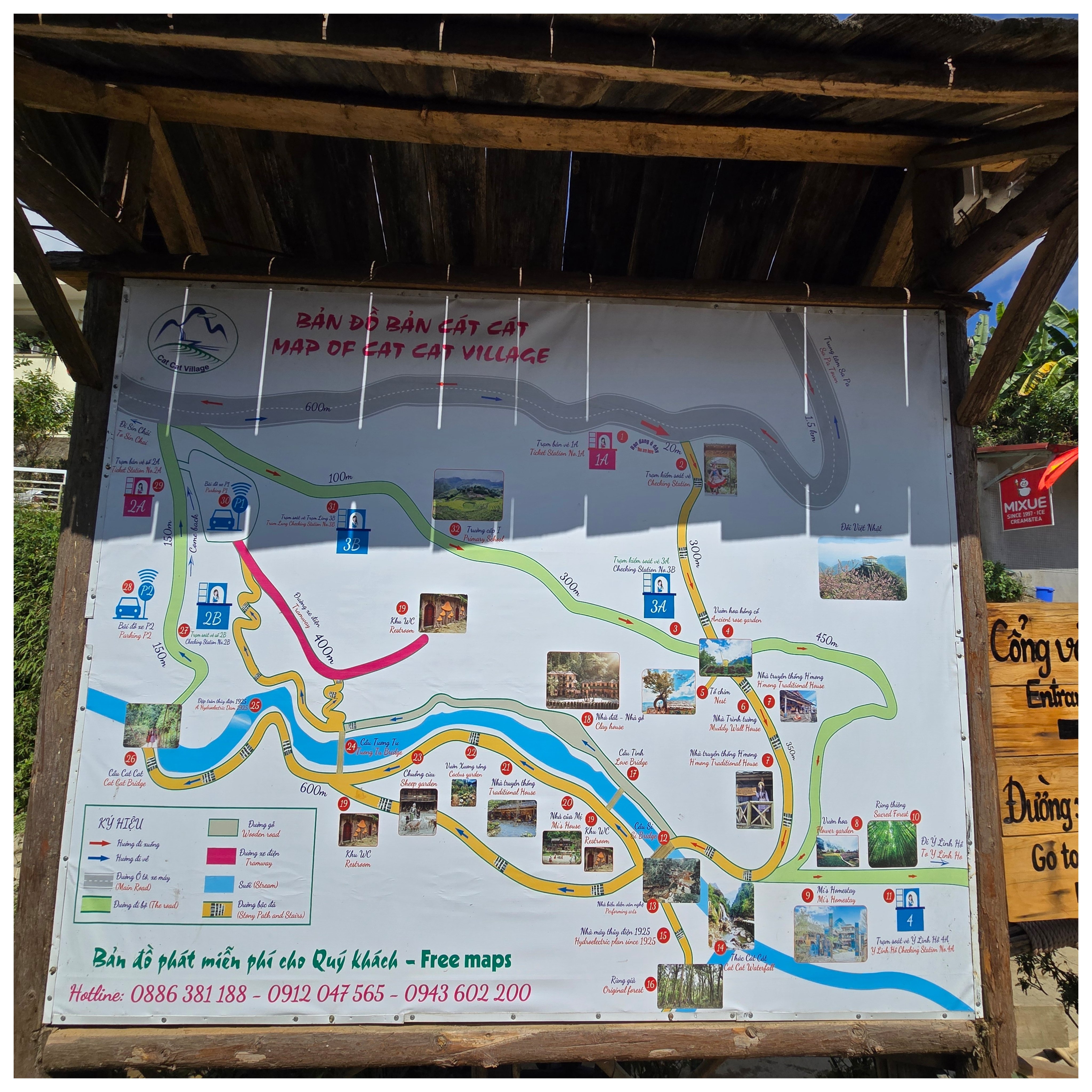 ก่อนจะเข้าไปหมู่บ้าน Cat Cat ต้องซื้อตั๋วก่อน ซึ่งจุดขายตั๋วอยู่ไม่ไกลจากร้านเช่าชุด มีป้ายราคาชัดเจน แถมมีแผนที่ให้ดูว่าด้านในมีอะไรน่าเที่ยวบ้าง