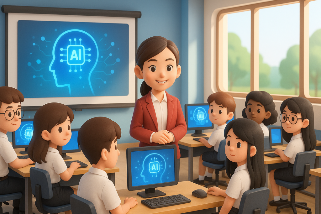 เนื้อหาที่สื่อในภาพคือครูกำลังแนะนำการใช้งาน AI ที่เหมาะสม