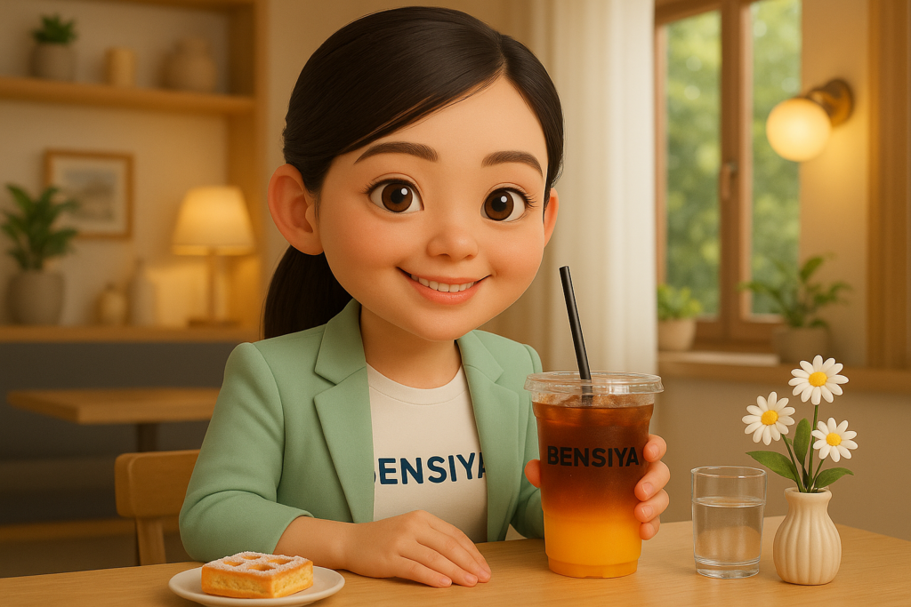 ตัวละครกำลังนั่งที่โต๊ะไม้ในบ้าน บรรยากาศน่าอยู่และเป็นกันเอง มือถือแก้วเครื่องดื่ม (อเมริกาโน้/น้ำส้ม) มีหลอดสีดำ และข้อความ “BENSIYA” บนแก้ว บนโต๊ะมีขนมอบจานเล็ก แก้วน้ำเปล่า และแจกันดอกเดซี่เล็ก ๆ